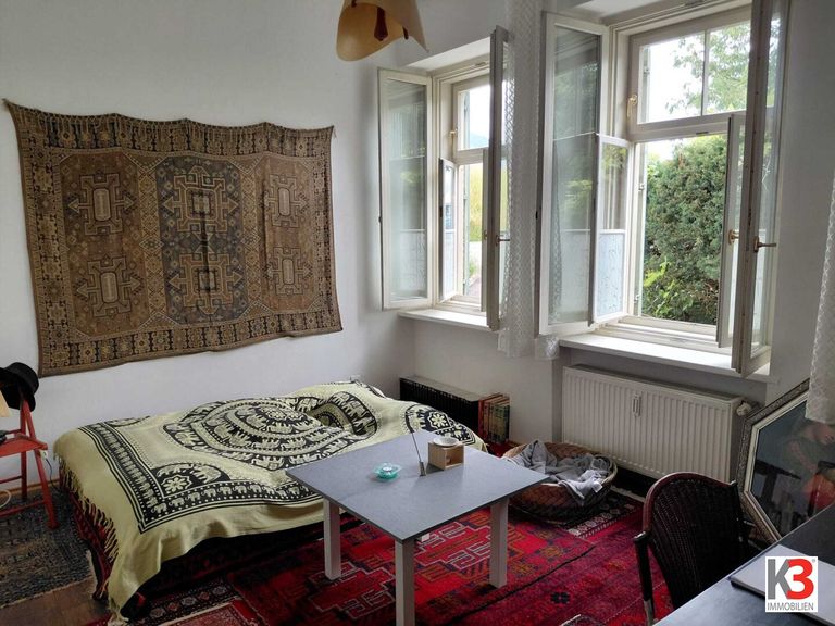 Vom Vorraum aus gelangt man zur kleinen Küche, die praktisch eingerichtet ist und über einen Abstellraum verfügt. Das Wohnzimmer ist geräumig und die hohen Decken und großen Fenster geben ein hellen, luftigen und freundlichen Eindruck.
