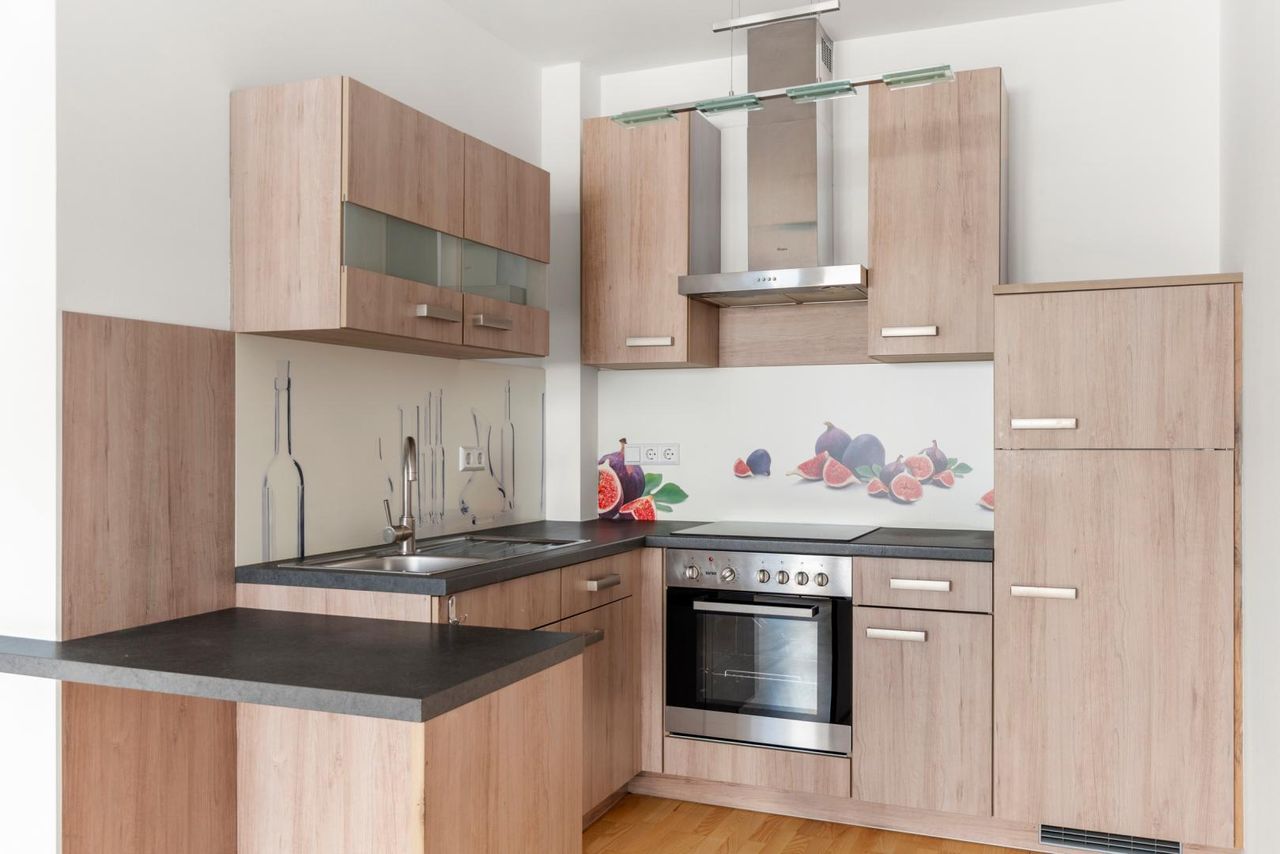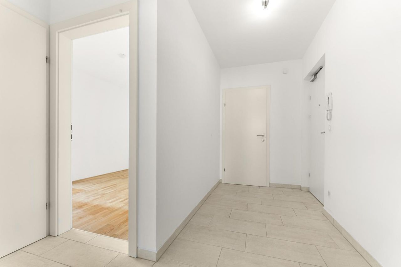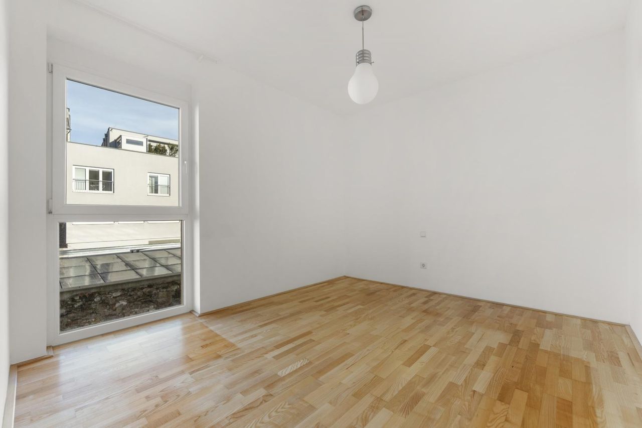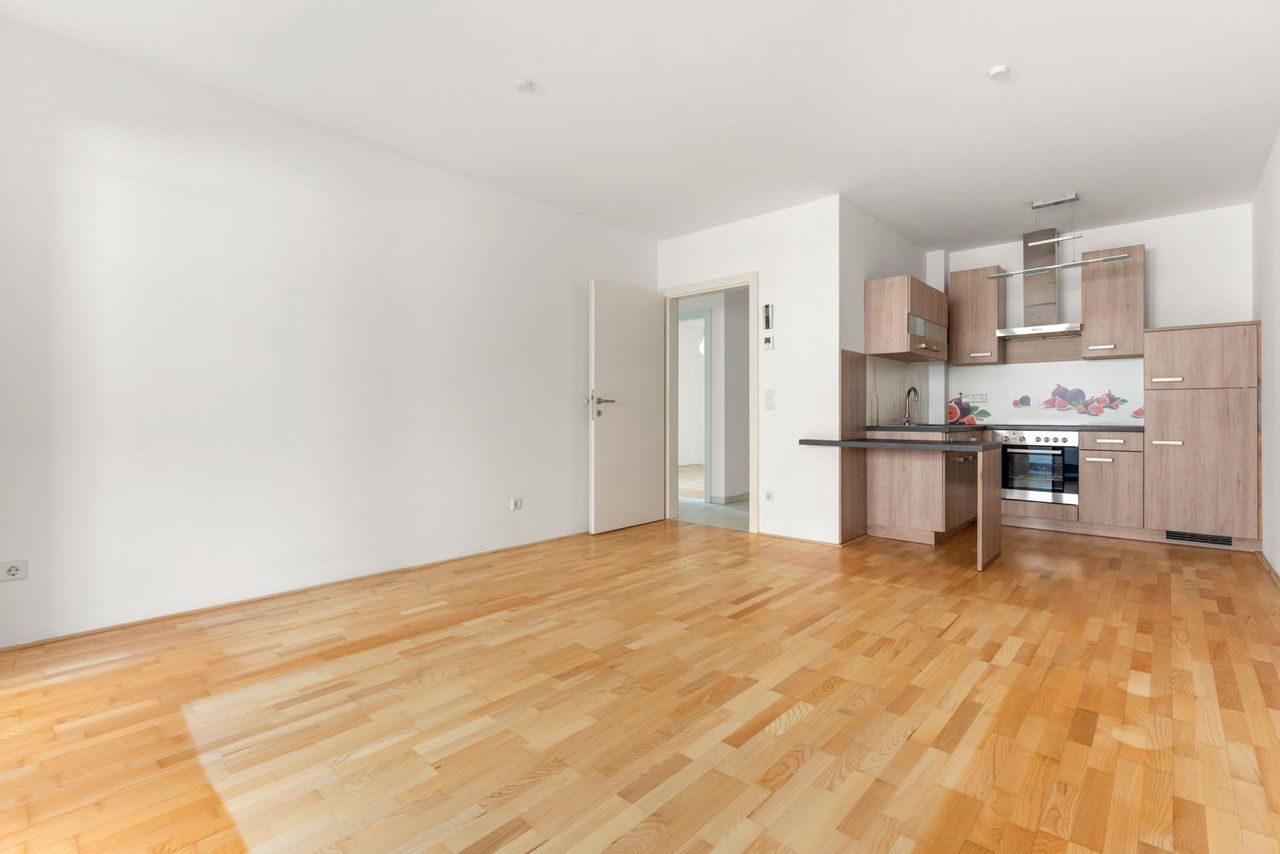 Die Wohnung bietet zwei helle (Schlaf-)Zimmer sowie einen großzügigen, offenen Wohn-/Essbereich mit integrierter Küche. Vom Koch-/Wohn-/Essbereich und von einem Zimmer aus gelangen Sie auf die ca. 7,07 m² große Loggia, die zusätzlichen Lebensraum im Freien schafft und zum Entspannen einlädt – mitten in der Stadt und dennoch angenehm ruhig. Das moderne Badezimmer überzeugt mit einer hochwertigen Dusche, das WC ist praktisch separat angeordnet. Ein kleiner Abstellraum und ein Kellerabteil mit einer Größe von ca. 6 m² bieten zusätzlichen Stauraum.