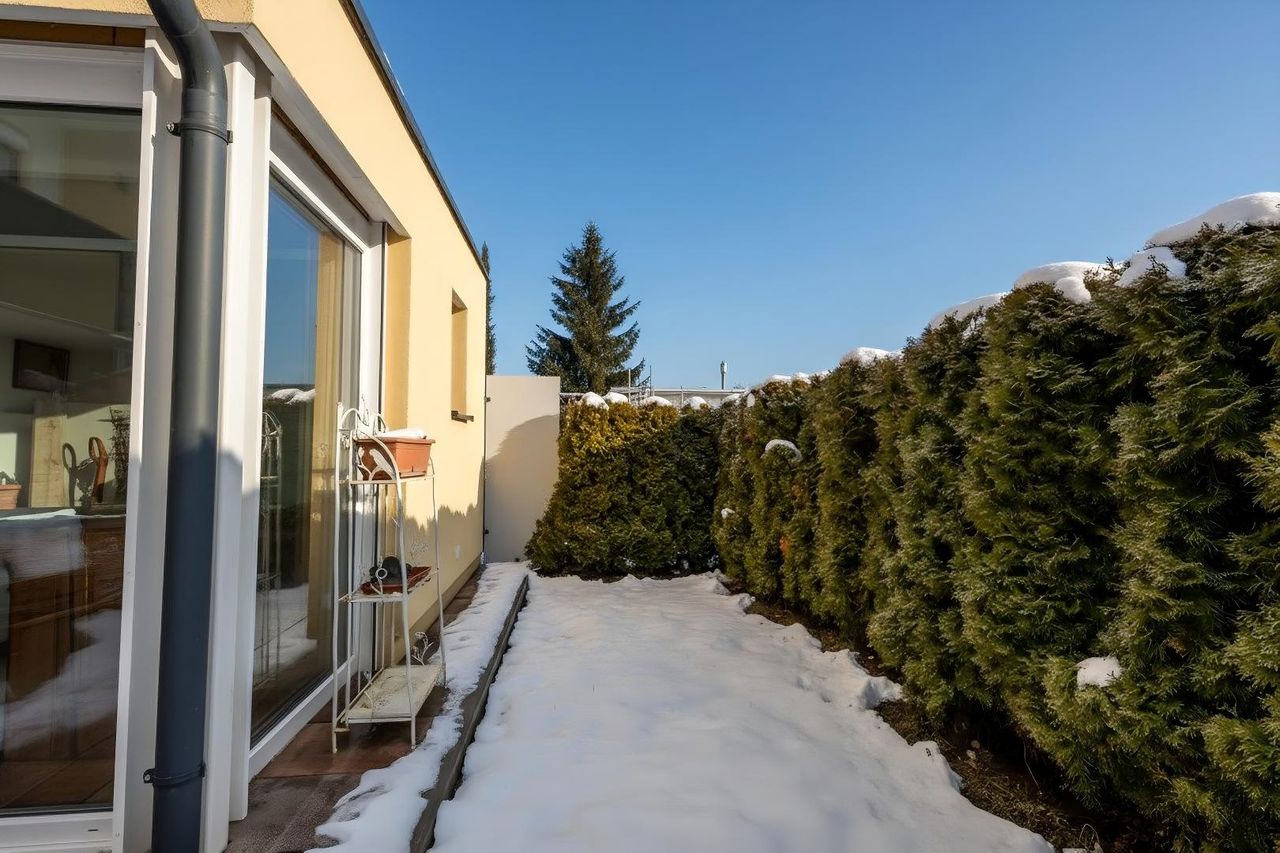 Die großzügige Terrasse erweitert den Wohnraum ins Freie und bietet viel Platz für entspannte Stunden. Der private Garten schafft zusätzlichen Freiraum direkt vor der eigenen Wohnung.
