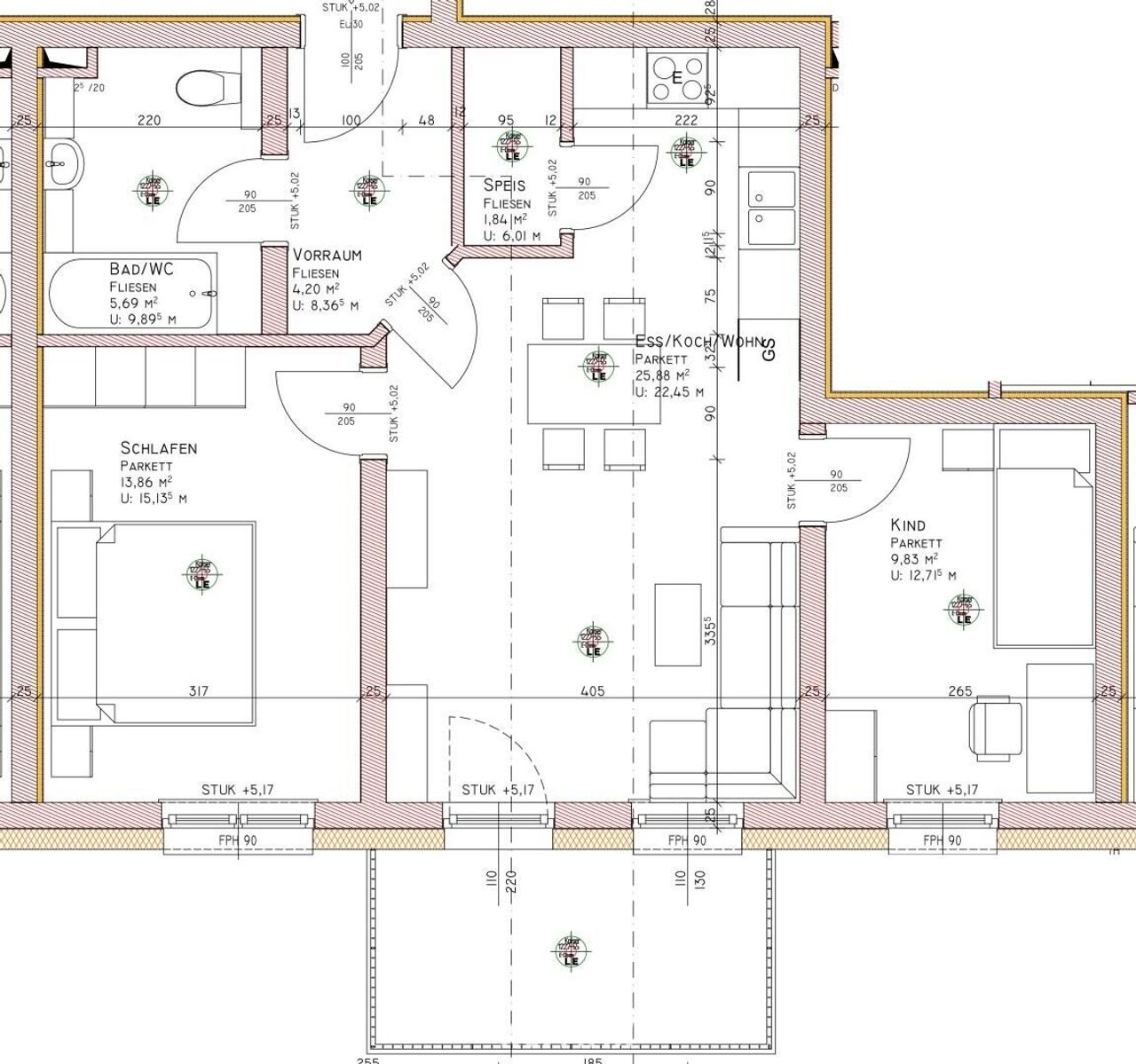 Es kommen insgesamt 22 freie Stellplätze zur Ausführung, wobei jeweils 2 Stellplätze bereits im Kaufpreis inkludiert sind.