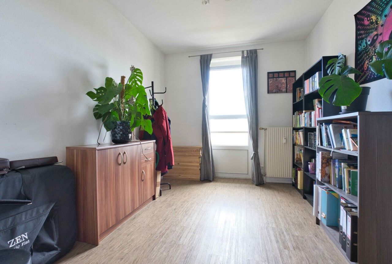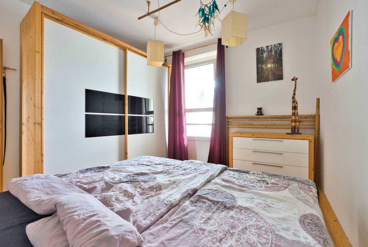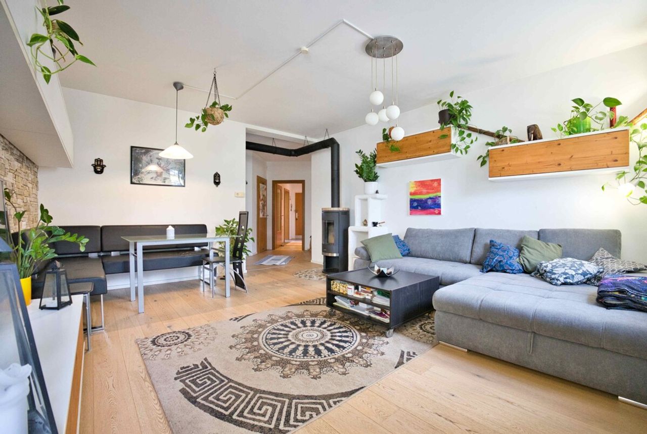 Herzstück der Wohnung ist das helle, großzügige Wohnzimmer mit gemütlichem Kaminofen, der an kühleren Tagen für eine angenehme Wohnatmosphäre sorgt. Von hier aus gelangen Sie auf die Loggia sowie direkt in den liebevoll nutzbaren Garten – ideal für entspannte Stunden im Freien, gesellige Abende oder als geschützter Spielbereich für Kinder. Die drei Schlafzimmer sind gut geschnitten und vielseitig nutzbar, ob als Kinderzimmer, Homeoffice oder Gästezimmer.