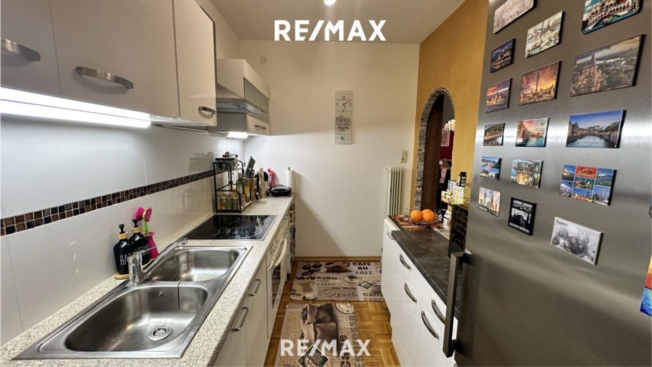 Der helle Wohnbereich schafft ein angenehmes Wohnambiente und bietet direkten Zugang zur Südwest-Loggia, die zum Entspannen und Genießen der Abendsonne einlädt. Die funktional gestaltete Einbauküche fügt sich harmonisch in das Gesamtbild der Wohnung ein und bietet ausreichend Platz für den täglichen Bedarf.