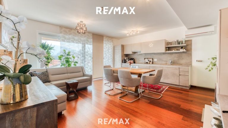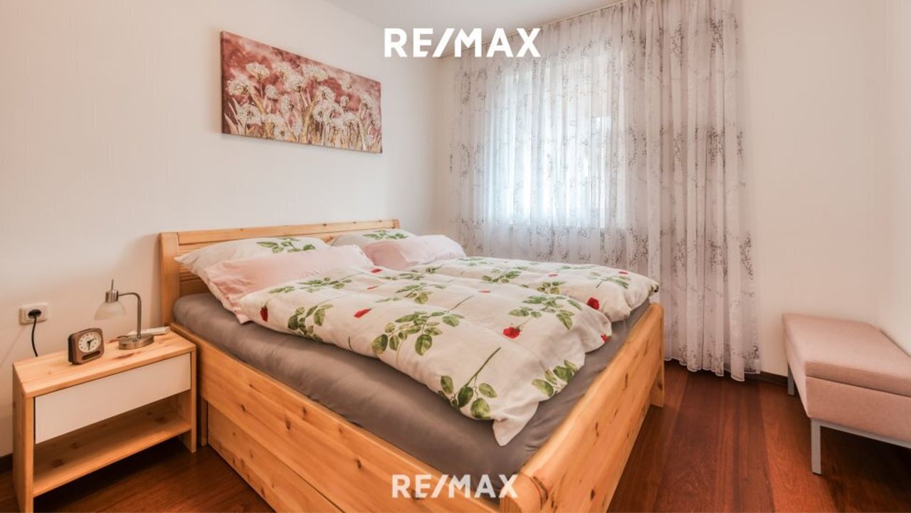 Das Herzstück der Wohnung bildet der großzügige Wohnbereich, ergänzt durch zwei weitere Zimmer, die sich flexibel als Schlaf-, Gäste- oder Arbeitsräume nutzen lassen. Eine einladende Loggia erweitert den Wohnraum ins Freie und bietet einen idealen Rückzugsort zum Entspannen und Genießen sonniger Stunden. Für zusätzlichen Komfort sorgt eine Klimaanlage, die auch an heißen Tagen ein angenehmes Raumklima gewährleistet.