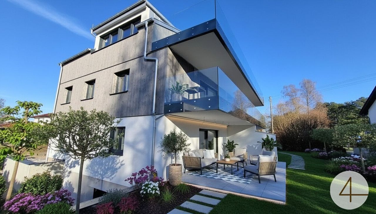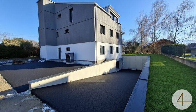 Das mit der modernen Holzfassade verkleidete Haus verfügt über eine Tiefgarage, in welcher je 2 Stellplätze pro Wohnung zugeordnet sind.