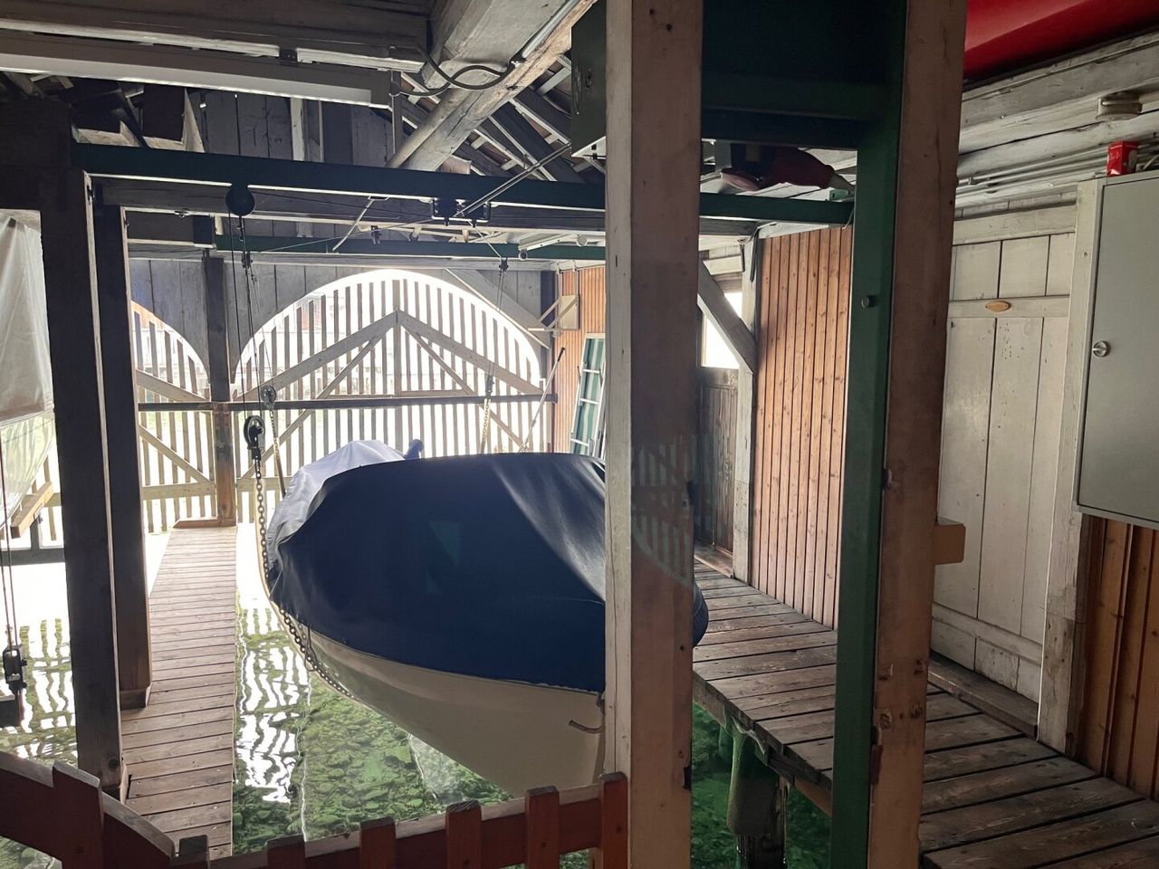 Die Ein-Zimmer Wohnung selbst besteht aus einem kleinen Vorraum, einem BAD / WC Raum, sowie einem Wohn/Schlafzimmer, in dem auch die Anschlüsse für eine Kochnische vorhanden sind. Vom Wohnzimmer aus betritt man auch die südseitig ausgerichtete Terrasse. Über den terrassierten und prächtigen Garten mit herrlichen Altbaumbestand gelangt man direkt zum See (Luftlinie von der Wohnung zum See: ca. 50m!!) Im seenahen Gartenbereich befindet sich ein Naturdenkmal (Eiche) sowie ein Lagerplatz für Surfbretter. Von dort aus gelangt man auf den Steg bzw. zum hauseigenem Bootshaus.