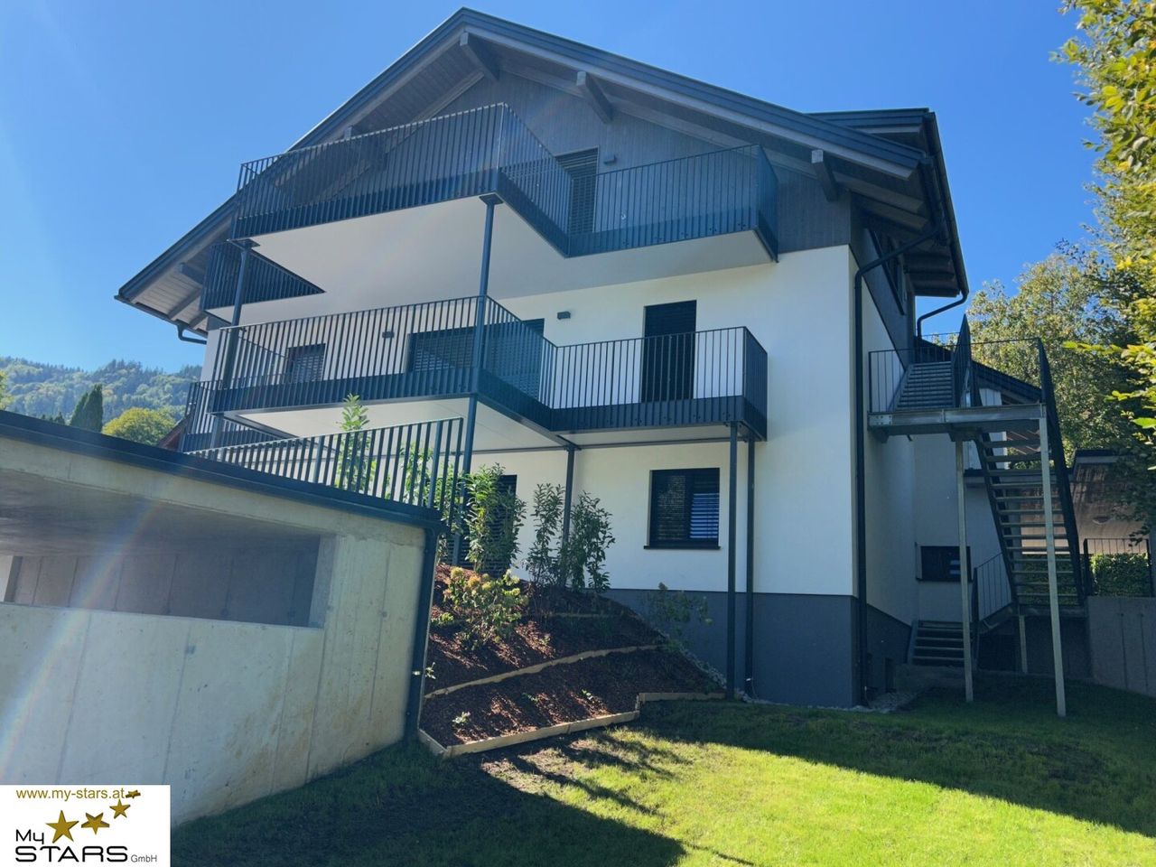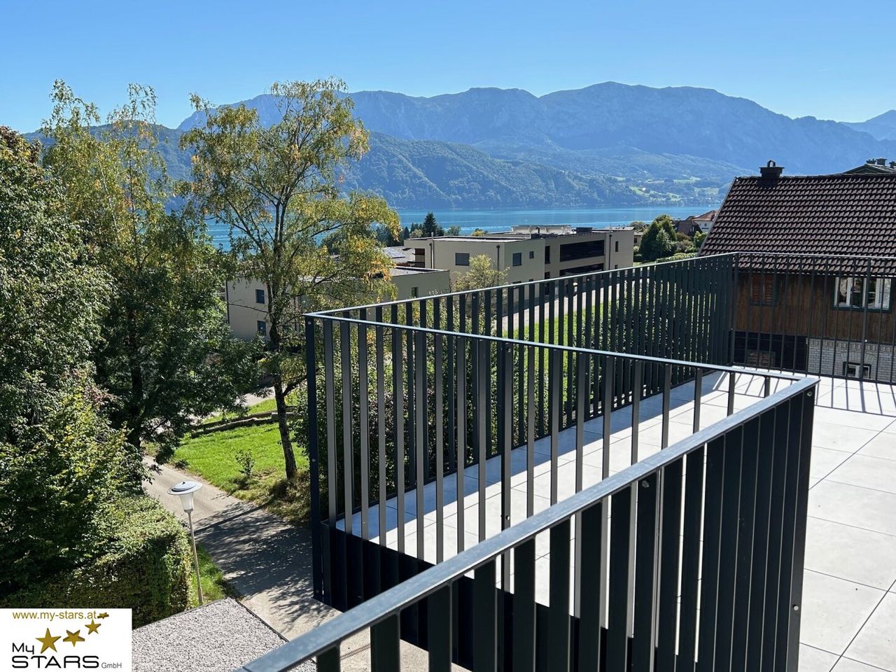 Die höher liegenden Wohnungen haben jeweils einen breiten, zum Attersee hin ausgerichteten Balkon.