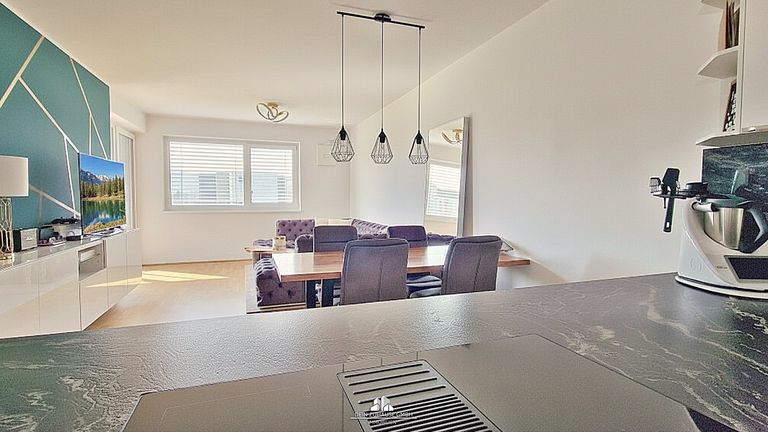 Große Fenster, elektrische Jalousien und ein durchdachtes Design schaffen eine ideale Wohlfühlatmosphäre. Die Wohnraumlüftung sorgt für Luftaustausch und an schönen Tagen genießen Sie die Wohnraumerweiterung durch die Loggia mit Grünblick.