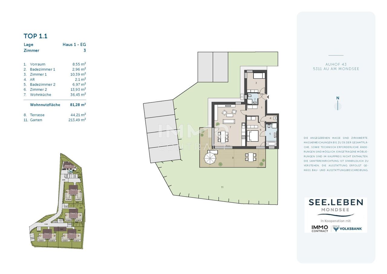 SEE.LEBEN Mondsee Exklusives Wohnen mit Seezugang und Bergpanorama. Fünf moderne Häuser mit insgesamt 12 Eigentumswohnungen und einer luxuriösen Villa schaffen ein außergewöhnliches Wohnambiente in traumhafter Lage. Dank der leichten Hanglage genießen alle Einheiten einen einzigartigen Ausblick auf den Mondsee und das Bergpanorama. Mit klarer Architektur, edlen Holzoptik-Elementen und durchdachten Grundrissen vereint SEE.LEBEN Mondsee modernes Wohnen und naturnahes Lebensgefühl. Das absolute Highlight: Ihr privater Seezugang mit Badesteg – ein Rückzugsort der besonderen Art. SEE.LEBEN Mondsee – Top 1.1 3-Zimmer-Gartenwohnung mit Traumterrasse • 81,3 m² Wohnfläche mit durchdachtem Grundriss • Großzügige 44 m² Südterrasse für sonnige Stunden • Privater 213 m² Garten...