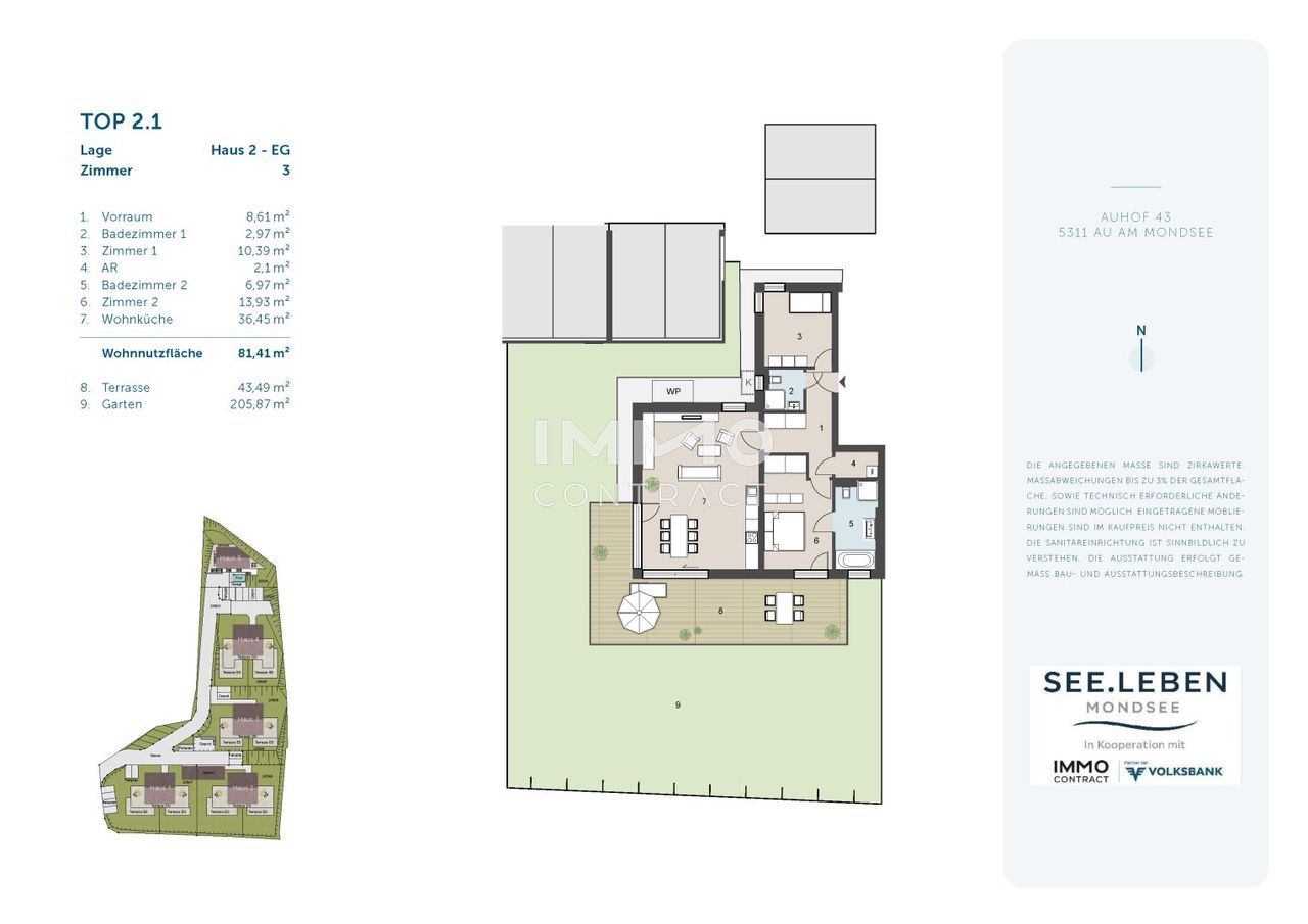 SEE.LEBEN Mondsee – Exklusives Wohnen mit Seezugang und Bergpanorama. Fünf moderne Häuser mit insgesamt 12 Eigentumswohnungen und einer luxuriösen Villa schaffen ein außergewöhnliches Wohnambiente in traumhafter Lage. Dank der leichten Hanglage genießen alle Einheiten einen einzigartigen Ausblick auf den Mondsee und das Bergpanorama. Mit klarer Architektur, edlen Holzoptik-Elementen und durchdachten Grundrissen vereint SEE.LEBEN Mondsee modernes Wohnen und naturnahes Lebensgefühl. Das absolute Highlight: Ihr privater Seezugang mit Badesteg – ein Rückzugsort der besonderen Art. SEE.LEBEN Mondsee – Top 2.1 3-Zimmer-Gartenwohnung in erster Reihe zum See • 81 m² Wohnfläche mit offenem Wohn-/Essbereich und durchdachtem Grundriss • Sonnige 43 m² Südterrasse mit...