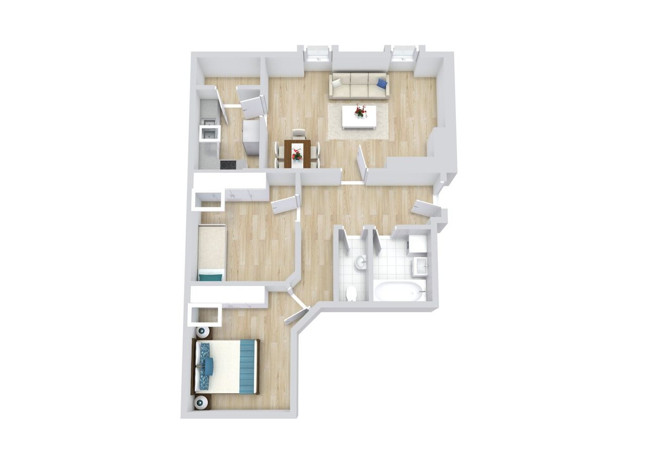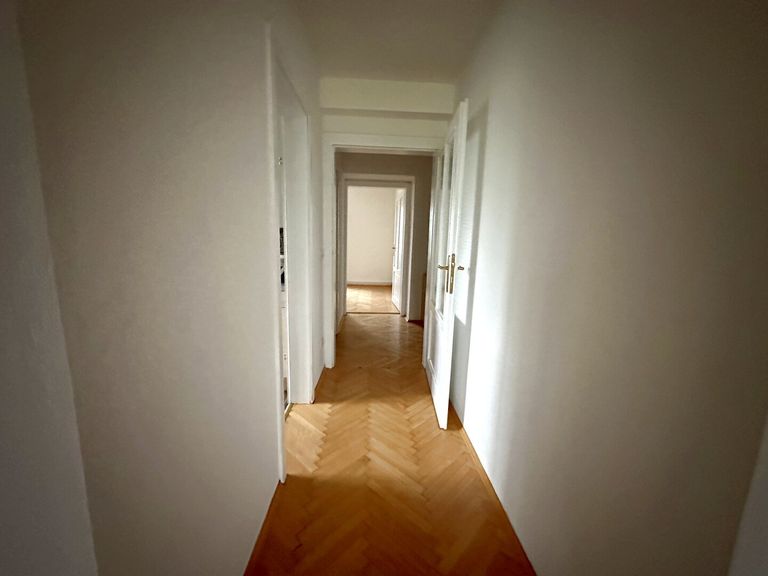 Beim Betreten der Wohnung fällt sofort der klassische Fischgrät-Parkettboden in den Wohn- und Schlafräumen ins Auge. Dieser verleiht der Wohnung einen stilvollen und zeitlosen Charakter. Die Nassräume sind in neutralen Farben gehalten und mit Fliesen ausgestattet.