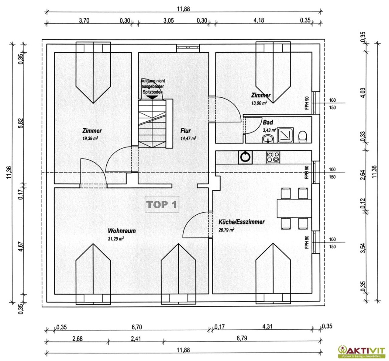 Die Wohnung befindet sich im 1. OG und inkludiert den Dachboden. Hier bietet sich die Möglichkeit zur Gestaltung nach eigenen Vorstellungen, die Bausubstanz in Massiv-Bauweise bildet hierfür die Basis.