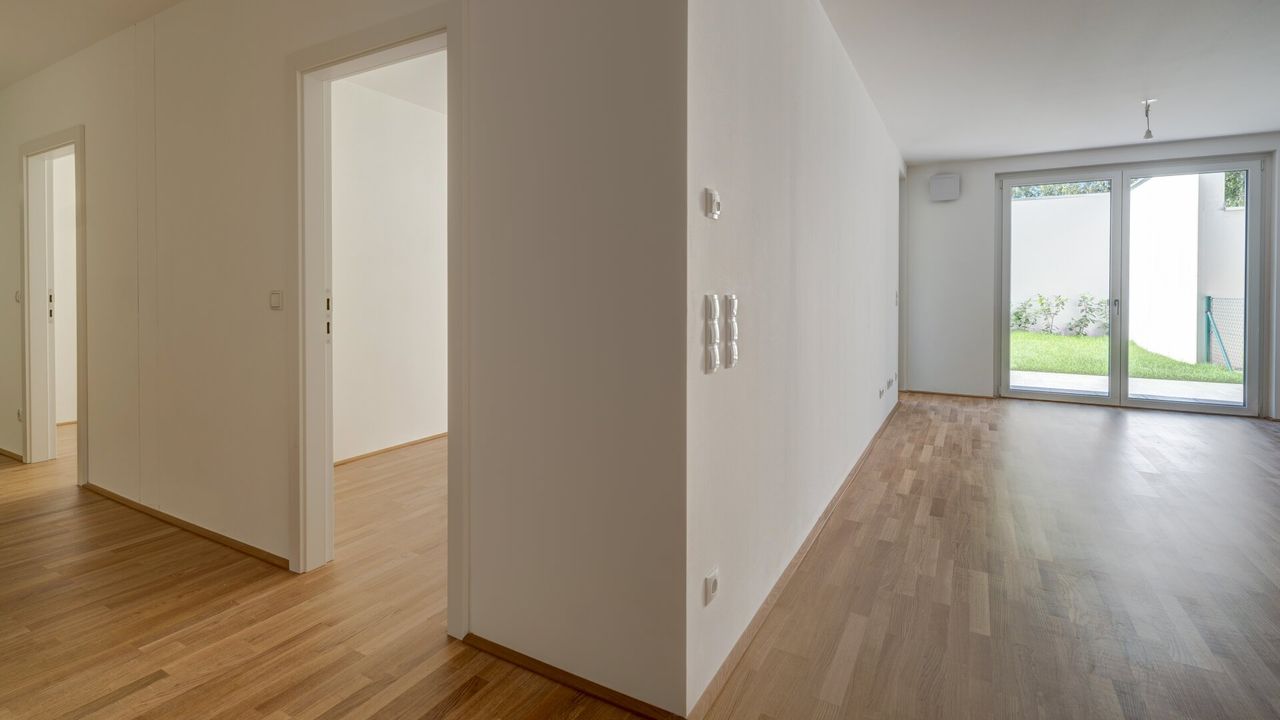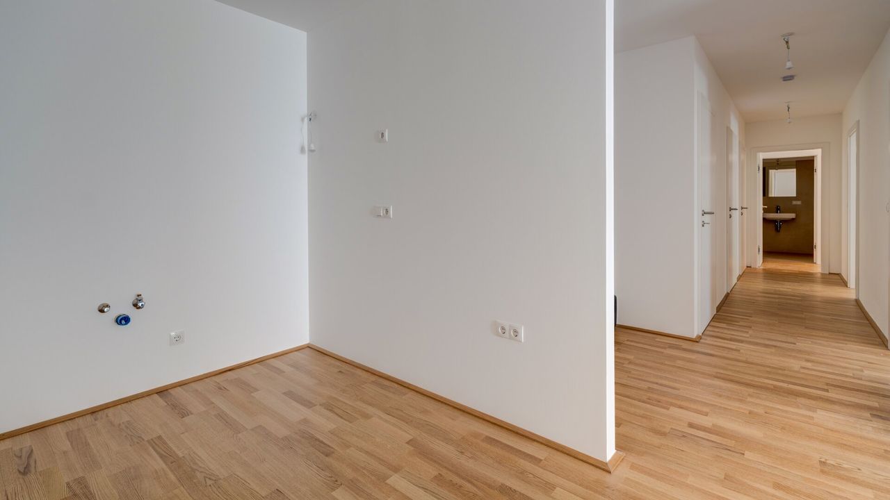 Durch den großzügigen Vorraum gelangen Sie sowohl in die offene Wohnküche als auch in den Flur, der zu einem Abstellraum, zwei Bädern und drei Schlafzimmern führt.