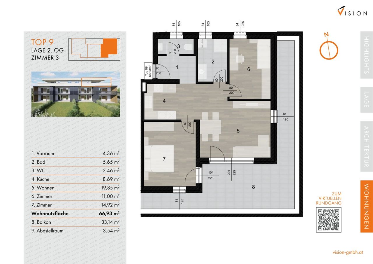 Diese hochwertige 3-Zimmer-Penthousewohnung im Dachgeschoss bietet eine Wohnfläche von ca. 66,93 m² und einen außergewöhnlich großzügigen Balkon mit ca. 33,14 m² – ideal für entspannte Stunden im Freien mit viel Privatsphäre.