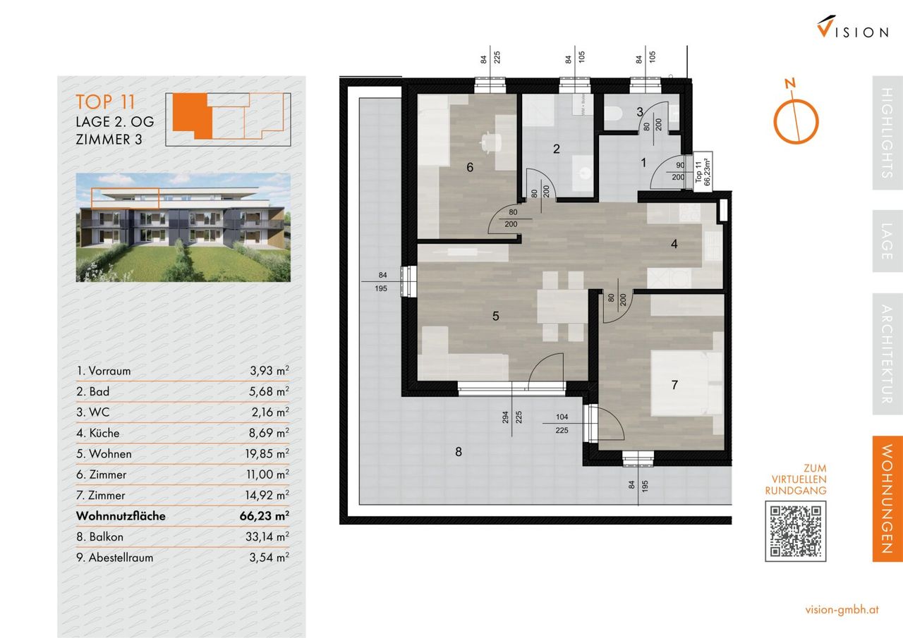 Diese hochwertige 3-Zimmer-Penthousewohnung im Dachgeschoss bietet eine Wohnfläche von ca. 66,23 m² und einen außergewöhnlich großzügigen Balkon mit ca. 33,14 m² – ideal für entspannte Stunden im Freien mit viel Privatsphäre.