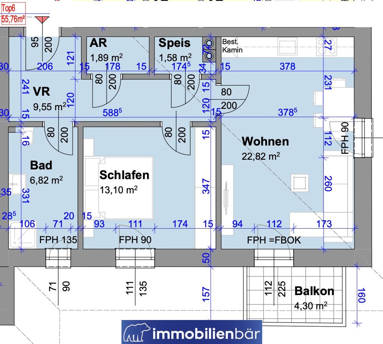 - TOP 6 – ca. 55,76 m² (2 Zimmer + Balkon)