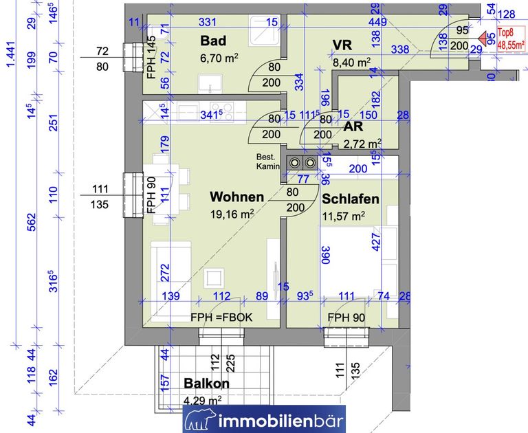 - TOP 8 – ca. 48,55 m² (2 Zimmer + Balkon) ...