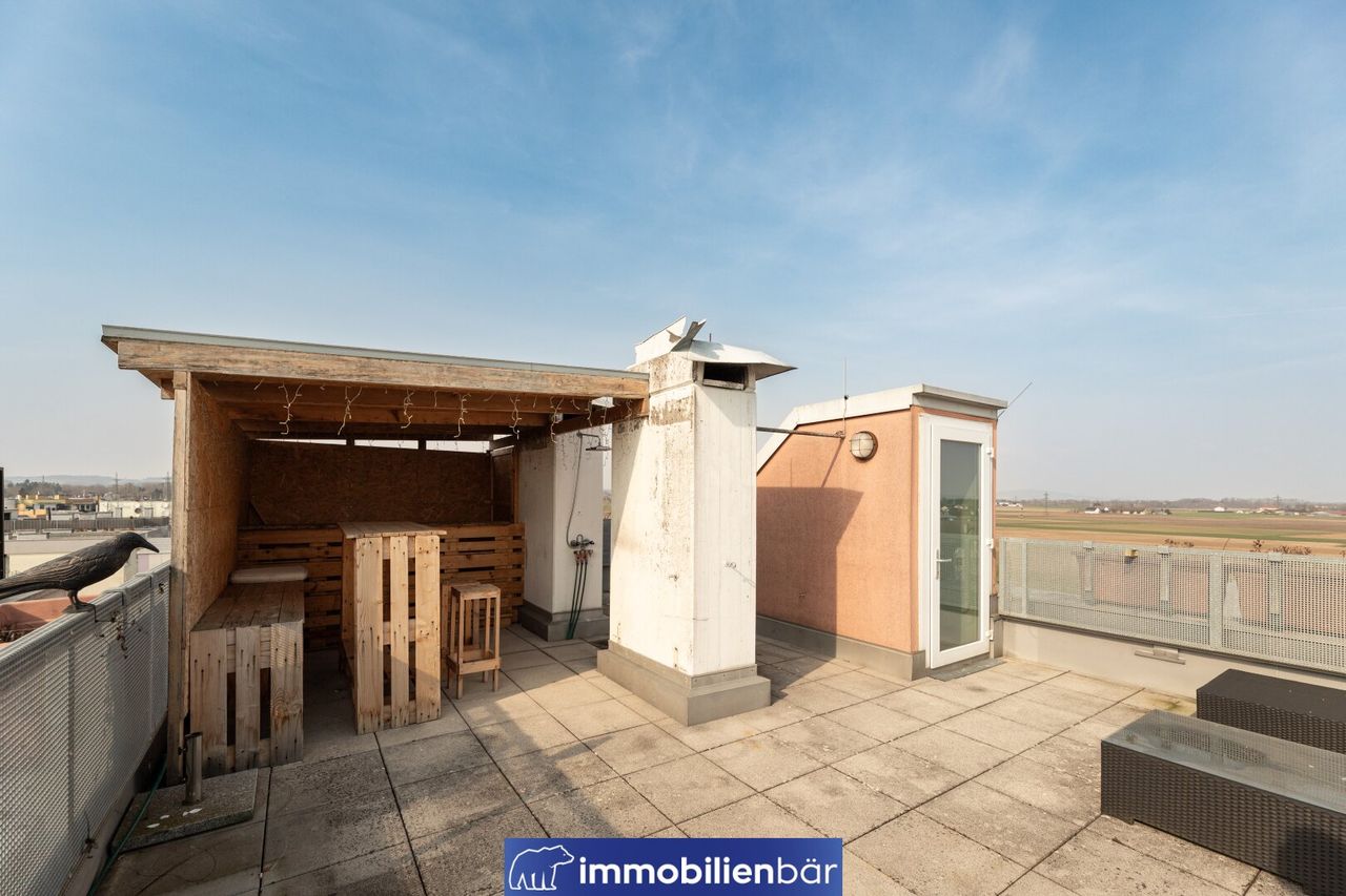 Ein besonderes Highlight ist die großzügige Dachterrasse. Hier genießen Sie viel Platz im Freien, einen schönen Rundumblick über Marchtrenk und bei klarer Sicht auch in die Berge. Dieser Außenbereich erweitert den Wohnraum und schafft einen idealen Ort zum Entspannen und Genießen.