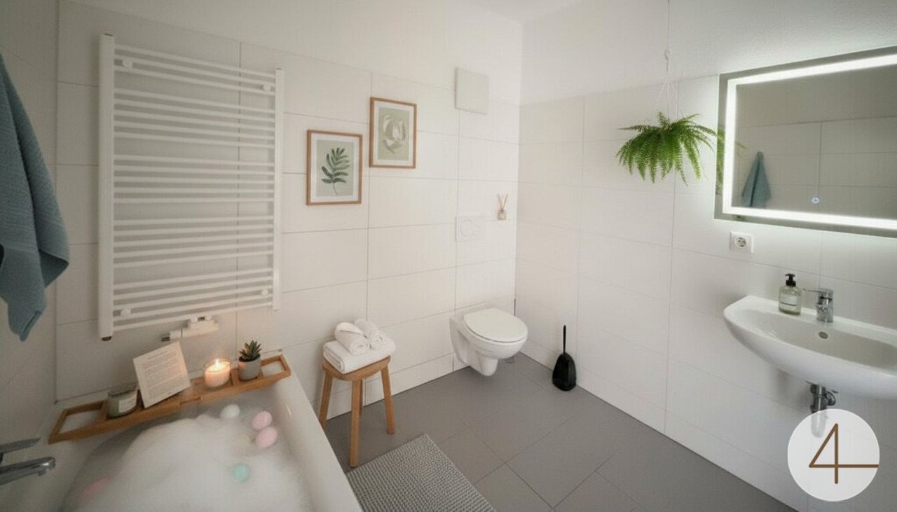 Das Badzimmer ist mit einer Badewanne ausgestattet, ideal für entspannende Wohlfühlmomente nach einem langen Tag.