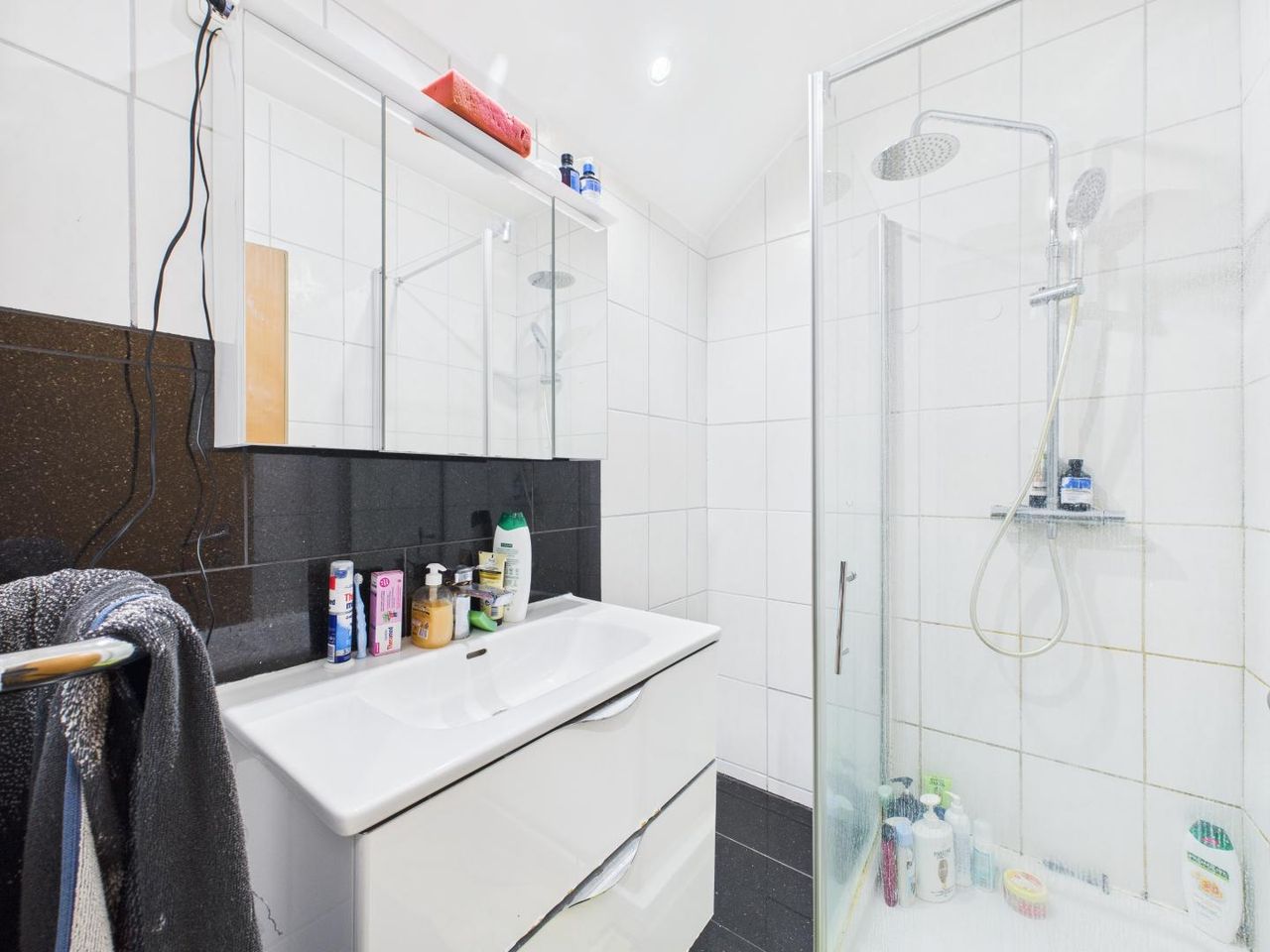 - modernes Badezimmer mit Dusche, großformatigen Fliesen und eleganten Badmöbeln