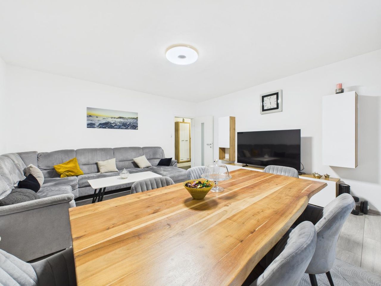 Im Mittelpunkt steht das großzügige Wohnzimmer – ein Raum, der sofort ein Gefühl von Weite und Wohlbehagen vermittelt. Hier lässt sich Wohnen, Essen und Entspannen harmonisch verbinden, ganz gleich, ob beim gemütlichen Abend mit Familie oder beim stilvollen Dinner mit Freunden.