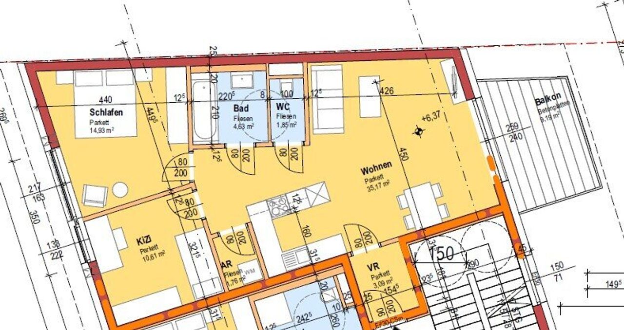 - Vorraum - Wohn/Ess/Küche - Bad mit Badewanne - separates WC - Abstellraum - Schlafzimmer - Kinderzimmer/Büro - Balkon
