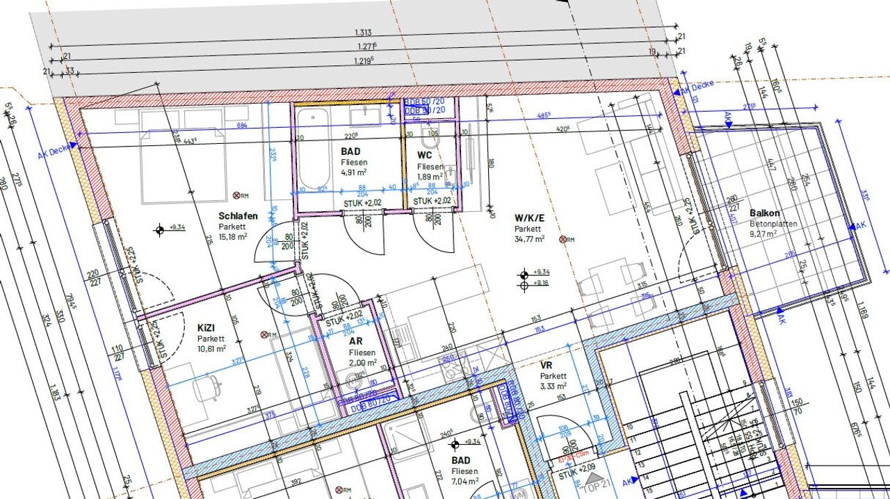 - Vorraum - Wohn/Ess/Küche - Bad mit Badewanne - separates WC - Abstellraum - Schlafzimmer - Kinderzimmer/Büro - Balkon