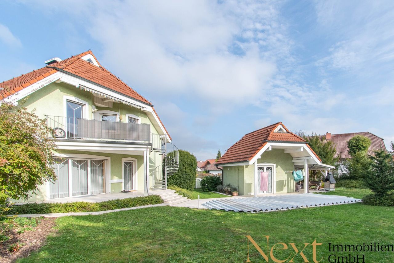 Vom offenen Essbereich und dem Wohnzimmer aus gelangt man direkt auf die nach Süden ausgerichtete Terrasse und in den traumhaften Garten, der mit seinen Baum- und Strauchlandschaften ein Gefühl von Urlaub aufkommen lässt. Dieses grüne Paradies, das über einen separaten Zugang erreichbar ist, verfügt außerdem über einen liebevoll angelegten Obst- und Gemüsegarten samt Geräteschuppen. Der großzügige Pool und das gemütliche Gartenhaus verwandeln den Garten in eine Wohlfühloase und laden zu entspannten Stunden im Freien ein.