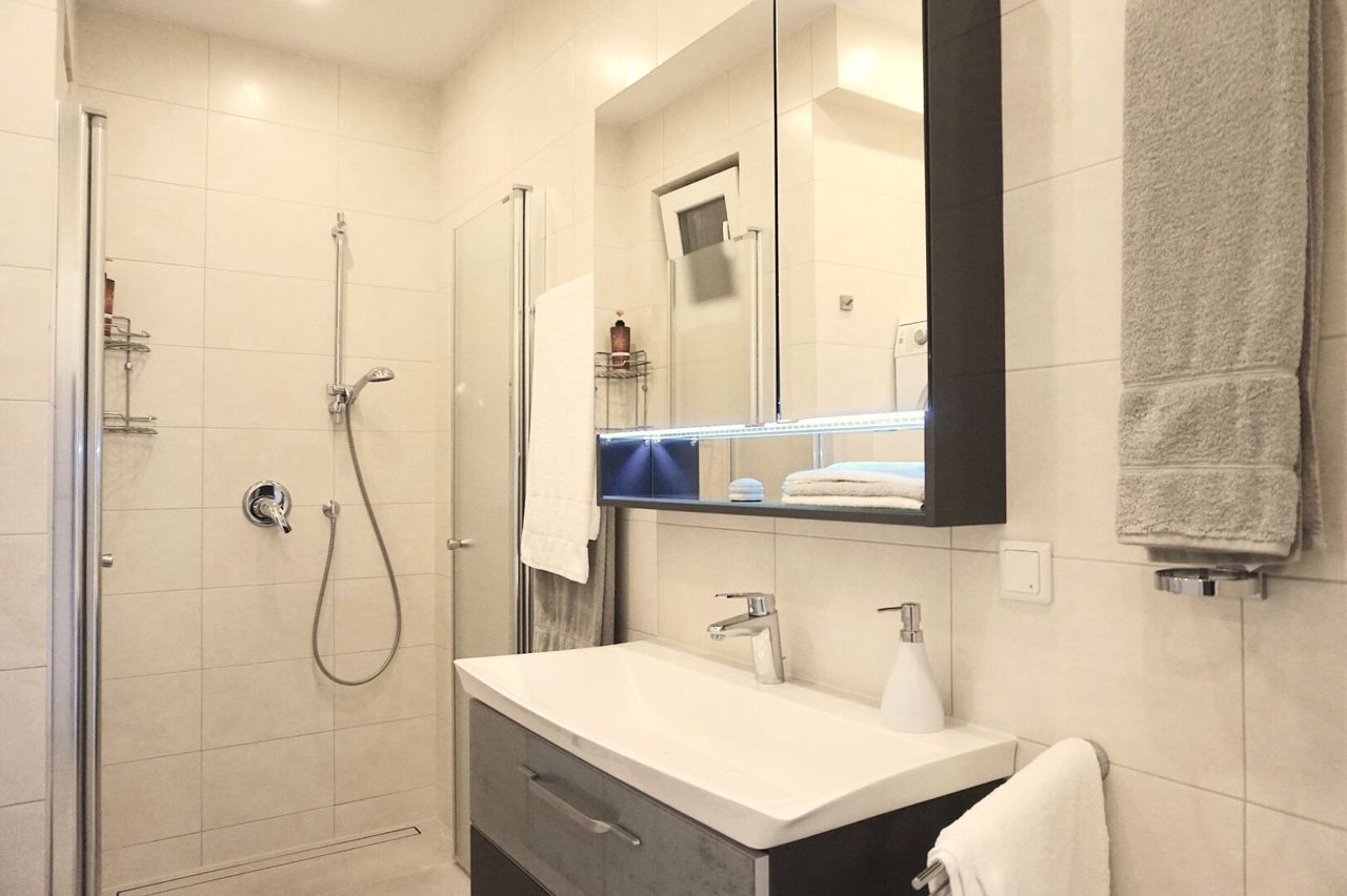 + Badezimmer mit Dusche, Waschbecken und Waschmaschine