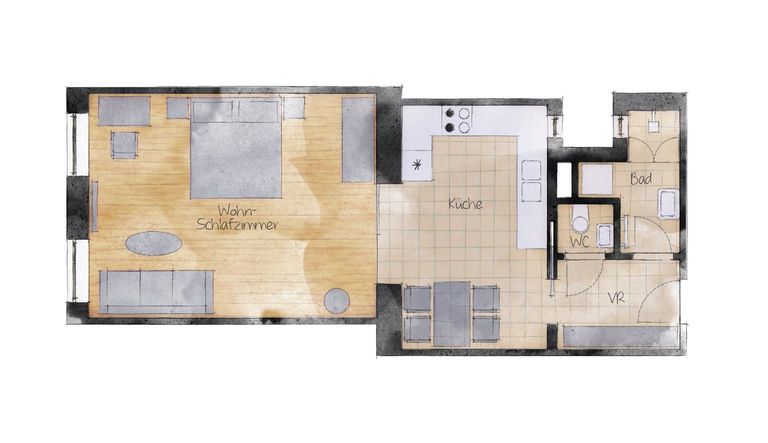 + Vorraum mit Einbauschrank erschließt Küche, Bad und WC
