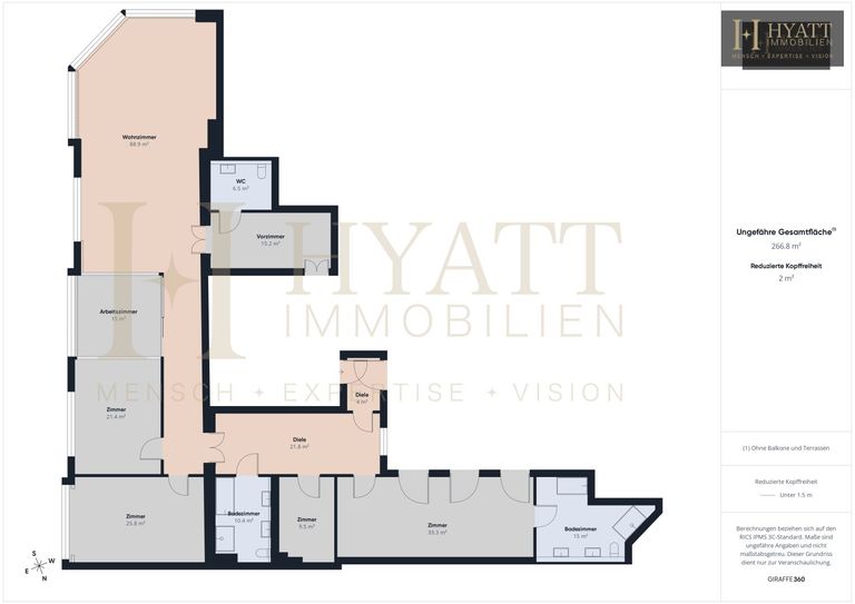 Auf rund 266 m² Wohnfläche entfaltet sich ein klar strukturierter Grundriss, der sowohl repräsentatives Wohnen als auch private Rückzugsorte ideal miteinander verbindet. Bereits beim Betreten vermittelt die großzügige Diele ein Gefühl von Weite und unterstreicht den hochwertigen Charakter dieser Residenz.