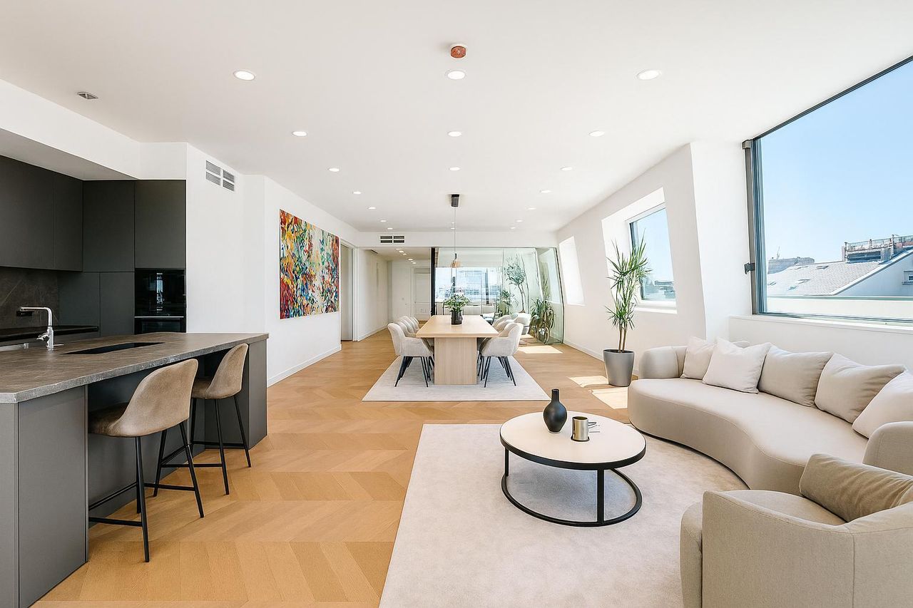 Schon beim Eintreten – der Lift führt direkt in die Wohnung – beeindruckt die Kombination aus erlesenen Materialien, modernster Technik und architektonischer Finesse. Der weitläufige Wohnbereich mit seiner außergewöhnlichen Formgebung und großen Fensterfronten ist das Herzstück des Penthouses. Die angrenzende Küche, offen gestaltet und dennoch dezent separiert, fügt sich harmonisch in das Gesamtkonzept ein. Der Blick auf die prächtigen Fassaden der Umgebung und die malerischen Dächer Wiens ist dabei ein ständiger Begleiter.