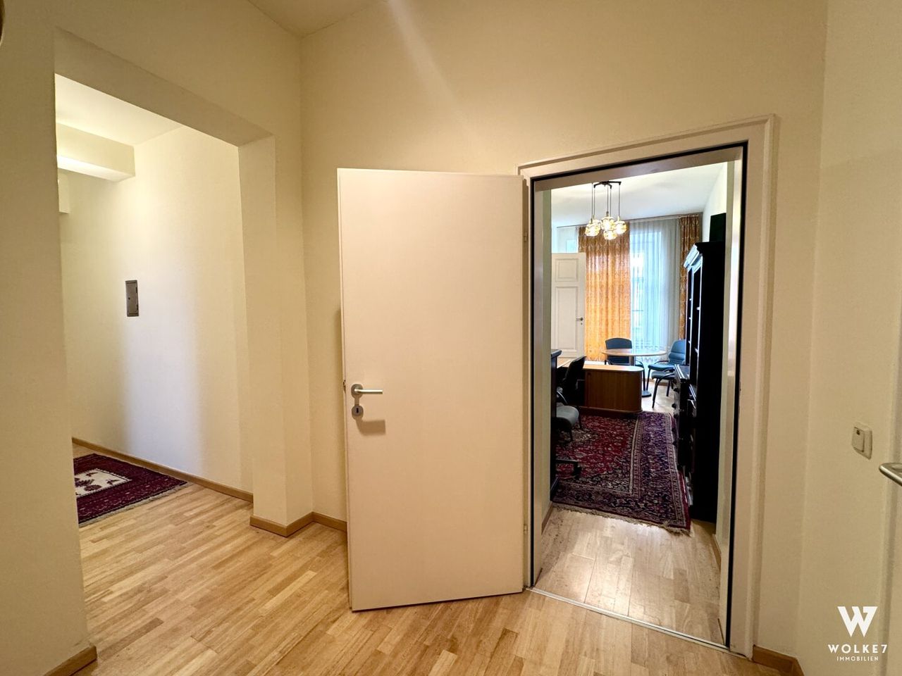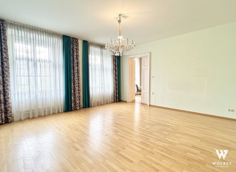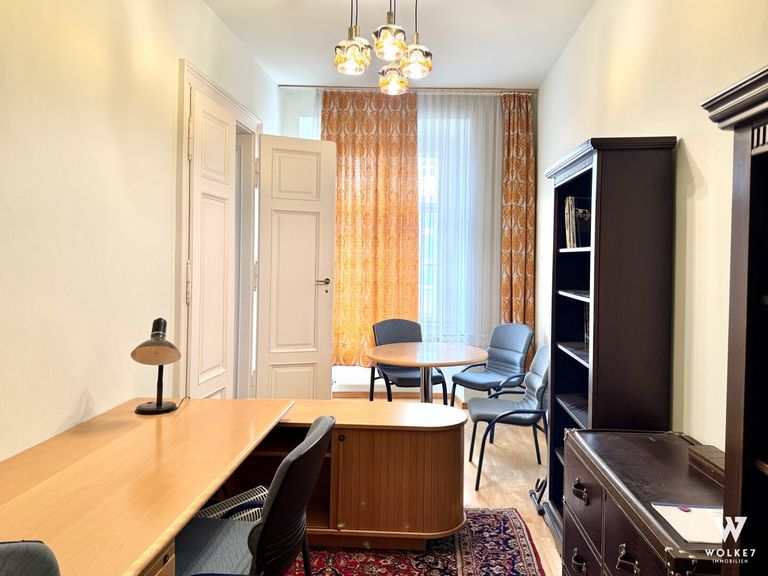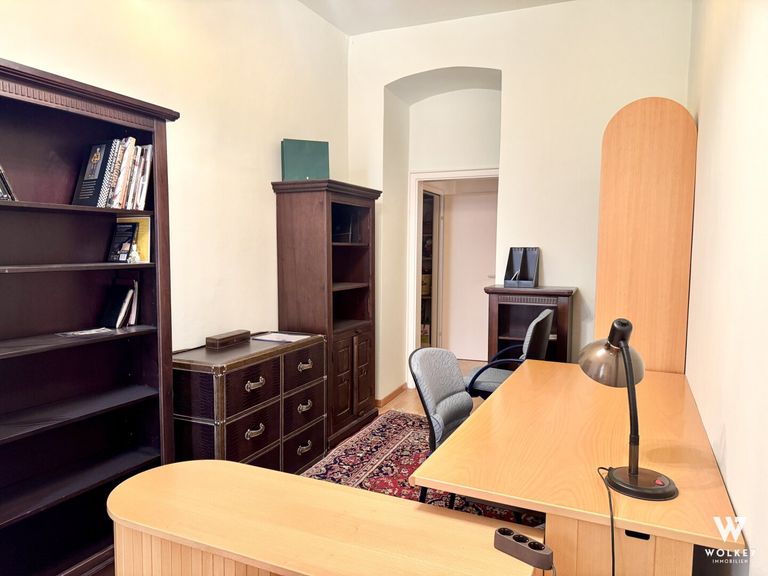 Ein besonderes Highlight ist das Kabinett, das sich ideal als Arbeitsraum eignet. Teile der vorhandenen Möblierung können auf Wunsch im Objekt verbleiben – in Abstimmung mit dem Erwerber.