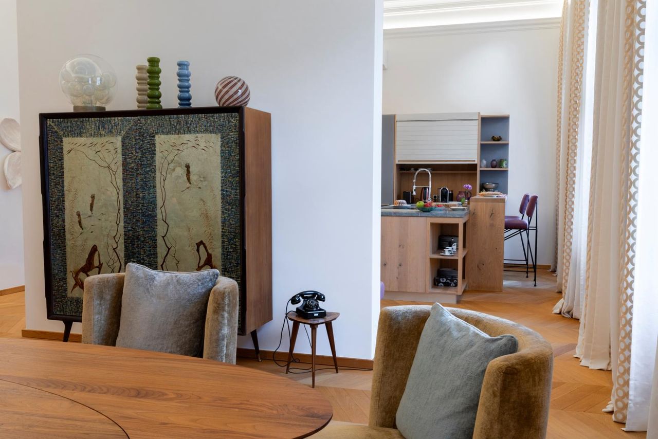 Die maßgefertigte Designküche mit Kochinsel ist hochwertig ausgestattet und fügt sich architektonisch harmonisch in den Raum ein. Der offene Grundriss erlaubt dennoch eine klare Zonierung von Wohn- und Essbereich.