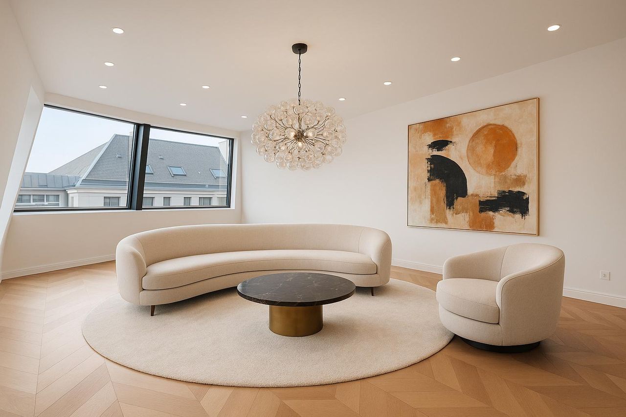 Der weitläufige Wohnbereich lädt mit seiner offenen Gestaltung und großen Fensterfronten zu stilvollem Wohnen und geselligen Momenten ein.