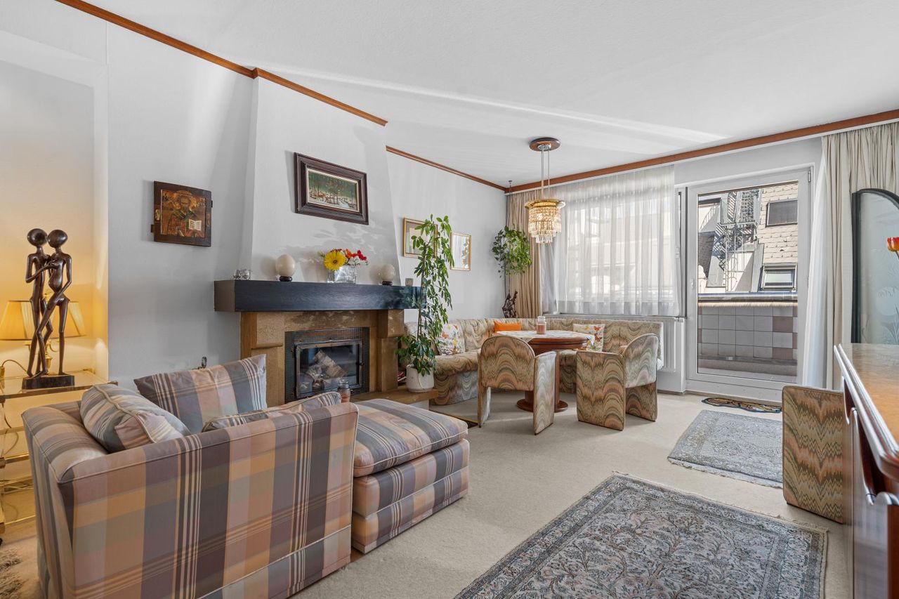 Helles Wohnzimmer mit gemütlicher Sitzgarnitur und offenem Kamin
