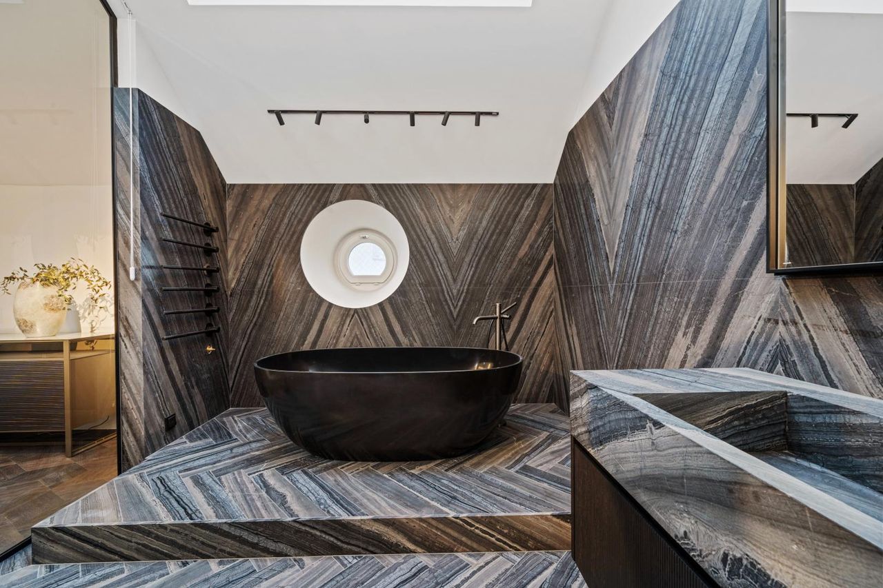 Gessi sowie einem Handtuchheizkörper von Vola lässt dieses Bad keine Wünsche offen.