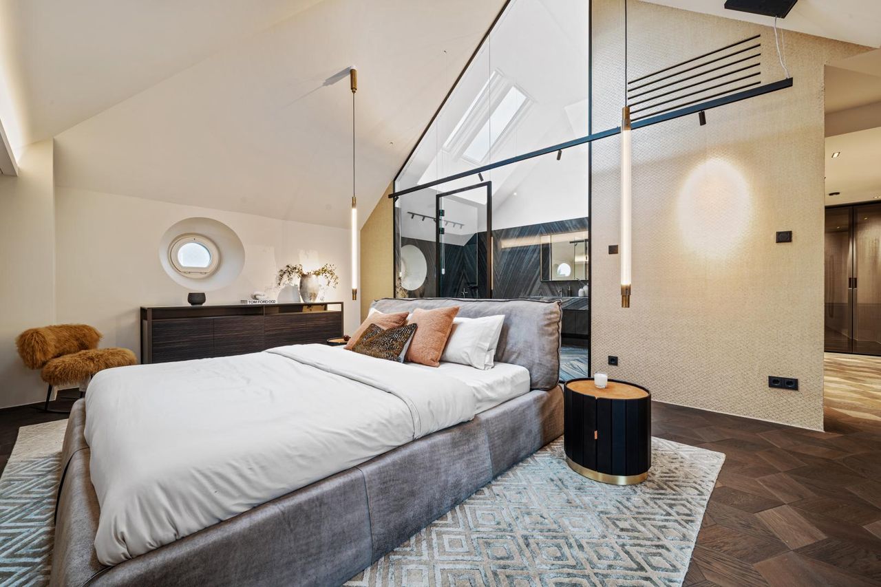 - Die außergewöhnliche Raumgestaltung des Schlafzimmers überzeugt mit einer beeindruckenden Raumhöhe von bis zu 4,50 m, die ein Gefühl