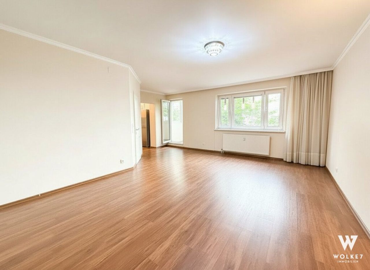 Großzügiges Wohnzimmer (ca. 26m2) mit Blick in den ruhigen, begrünten Innenhof – lichtdurchflutet und gemütlich