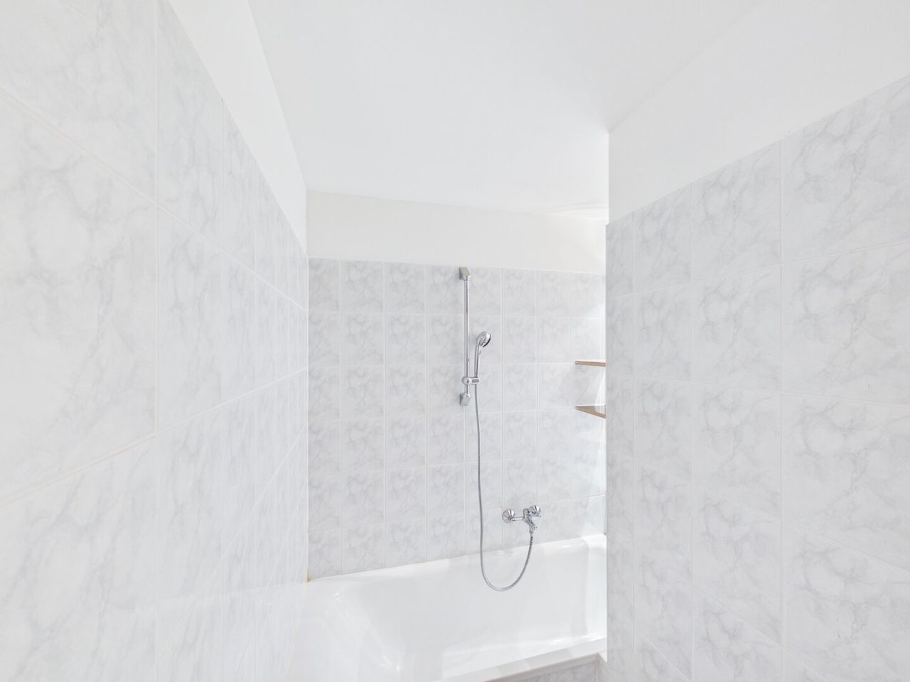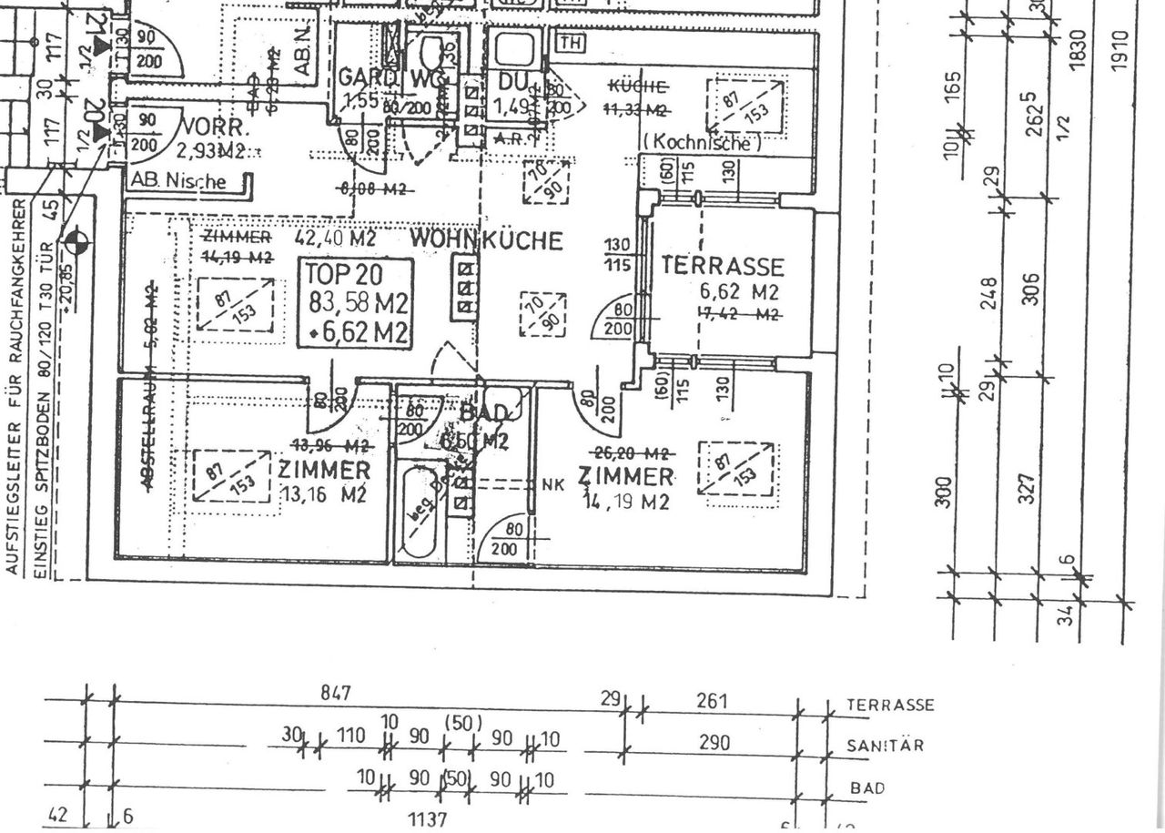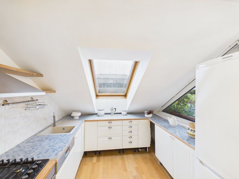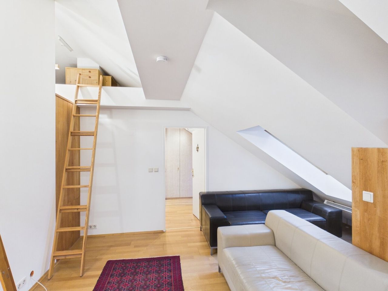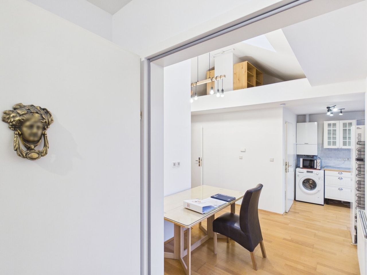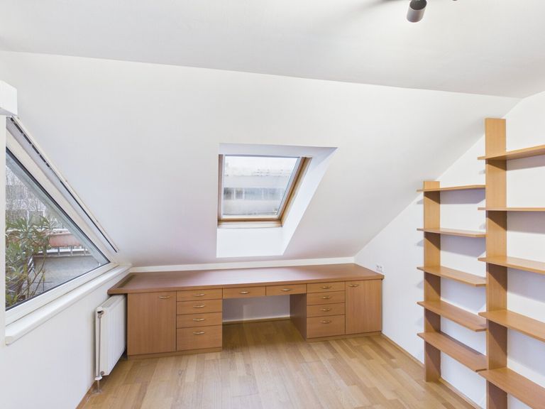 Die Küche ist mit einer stilvollen Einbauküche ausgestattet, die Ihnen alle Möglichkeiten bietet, kulinarische Kreationen zu zaubern. Dabei bietet die U Form genug Arbeits und Abstellfläche. Das kreative Deiecksfenster bietet eine der vielen schönen Perspektiven.Der Küchenbereich bietet auch den Blick auf den esszimmerbereich von dem man auf die romantische Dachterrasse gelangt. Von dort kommt man in eines der beiden Schlafzimmer, das bisher als Homeoffice genutzt wurde.Es ist lichtdurchflutet durch das Dachflächenfenster und ebenso ein Dreiecksfenster auf die Dachterrasse wodurch der Blick noch ins Grünne erweitert wird. Das Badezimmer ist ein echtes Highlight mit der Wanne hinter der Säule und Blick auf den Waschtisch Hier finden Sie sowohl eine Badewanne zum Entspannen. Eine separate Dusche neben der Küche im eigenen Raum ermöglicht 2 Personen sich gleicheitig fertig fürs Ausgehen zu machen. Vom Bad gelangt man auch in das 2. Schlafzimmer mit Wandschrank und Dachflächenfenster. Am Tag der Aufnahme war es dort besonders romantisch weil man das sanfte klopfen der Regentropfen hörte und die Wassertrofen wie funkelde Diamanten auf dem Fenste die Blicke fingen. Von dort kommt man in das Wohnzimmer mit den Stilelementen der zwei Leitern in den Luftraum. Dies ist ein für Wien sicher einzigartiges Stilelement und eröffnet weitere Perspektiven in die Räumlichkeiten. Das man in der Wohnung einen Rundgang machen kann durch die Räume hat auch einen besonderen Charm.Empfangen wird man im Vorzimmer von einer Vollholzgaderobe begrüßt. WC und Abstellkammer runden das Angebot ab.