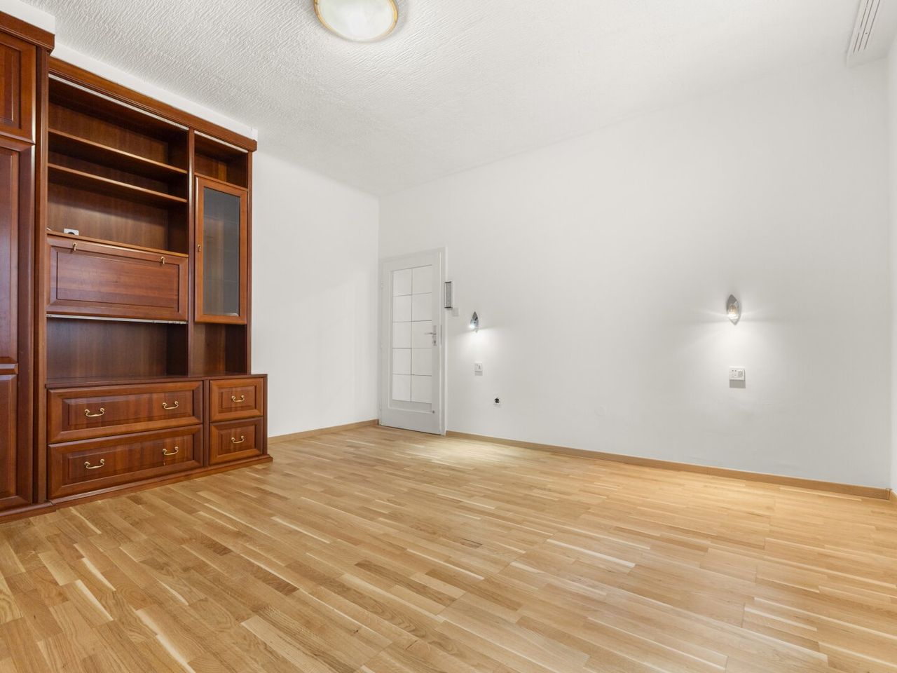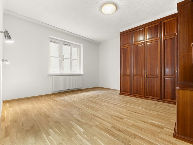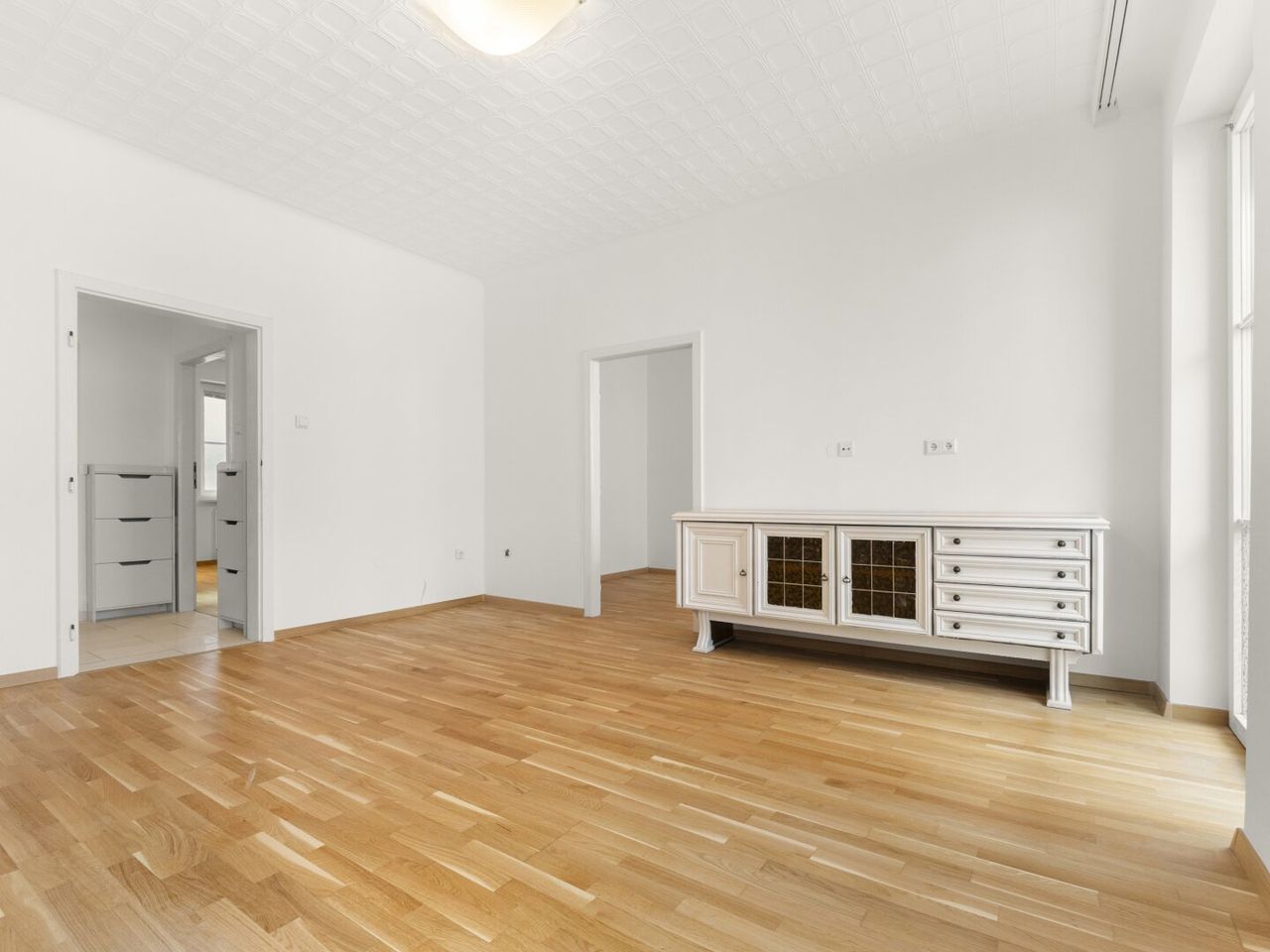 Bis auf das ans Wohnzimmer angrenzende kleine Schlafzimmer (Kabinett) sind alle Räume zentral vom Vorzimmer aus begehbar.