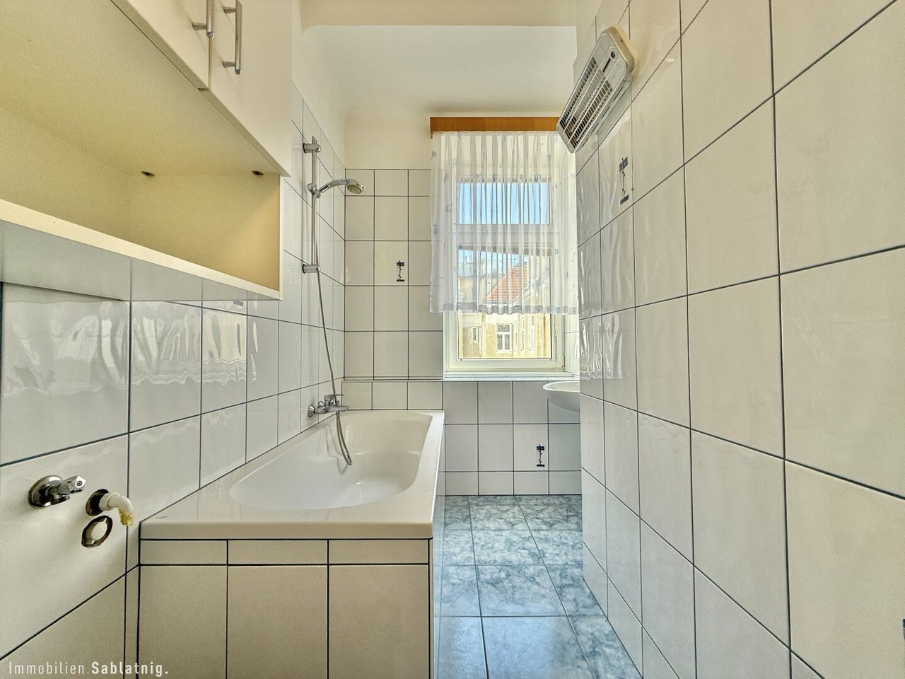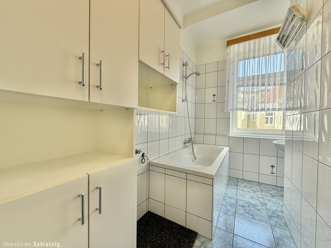 Badezimmer mit Fenster, Badewanne & Dusche, Handwaschbecken, Waschmaschinenanschluss, möbliert