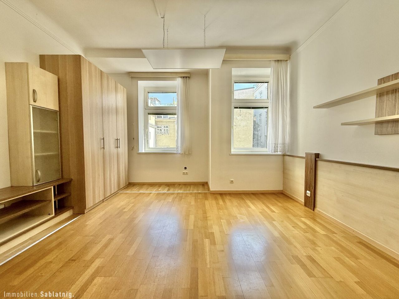 Wohn-/Schlafzimmer (2 Fenster), teilweise möbliert, klassischer Parkettboden