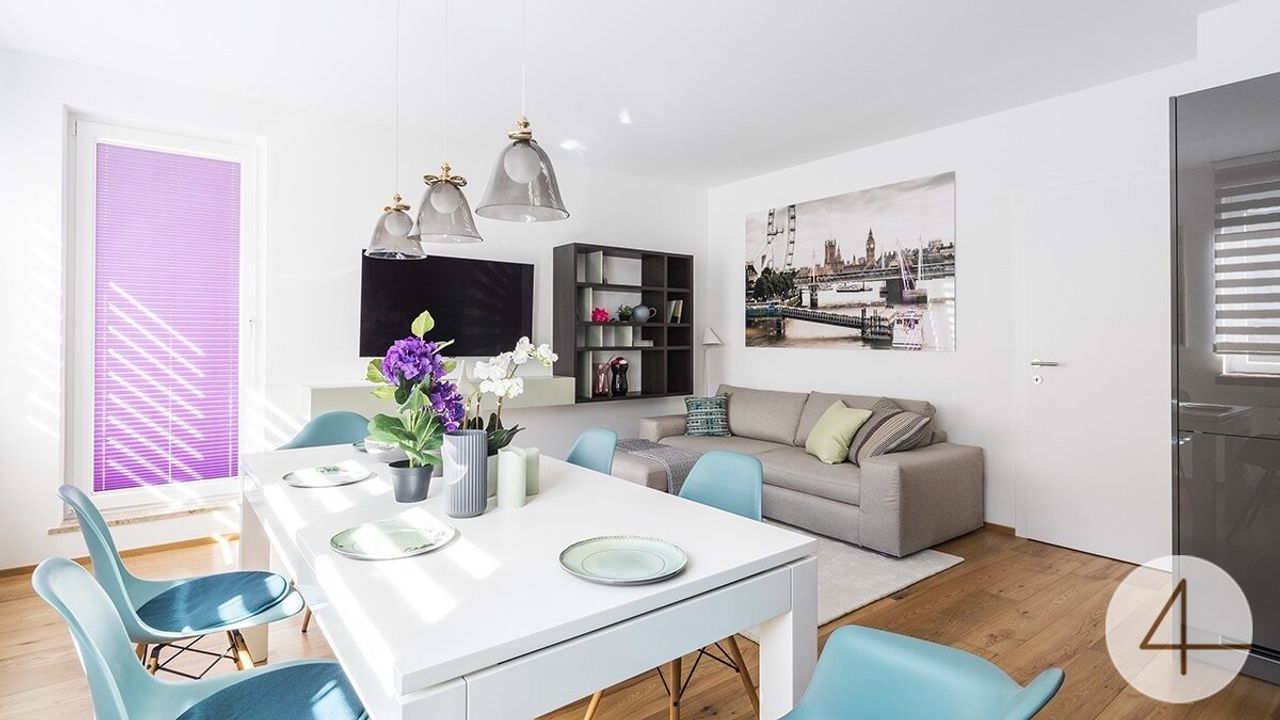 Die Wohnung wurde mit Unterstützung einer Innenarchitektin hochwertig gestaltet und ausgestattet. Großzügiger Wohn-Essbereich mit Loggia, drei weitere Zimmer (zwei mit Balkonzugang), getrenntes Bad und WC, großes Kellerabteil sowie Garagenplatz. Bezugsfertig – einziehen und loslegen.