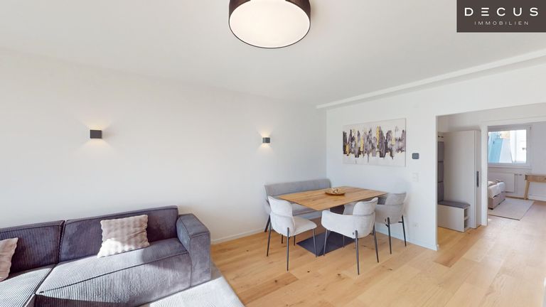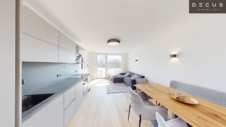 Die Designerküche ist voll ausgestattet – inklusive Induktionsherd und hochwertigen Geräten – und fügt sich harmonisch in den offenen Wohnbereich ein. Wohnzimmer sowie ein Schlafzimmer sind bereits stilvoll möbliert; im Kaufpreis inkludiert sind die Küche und Badmöbel, die übrige Einrichtung ist nicht Bestandteil des Kaufpreises.