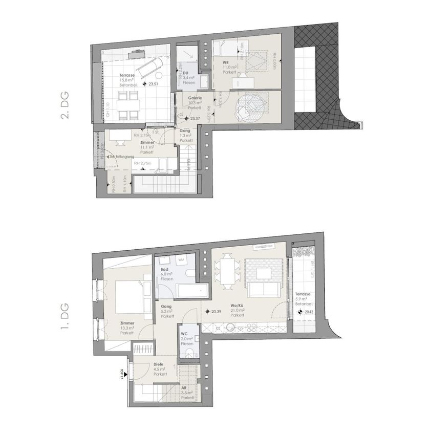 Eine Treppe führt ins zweite Dachgeschoss, wo sich eine lichtdurchflutete ca. 10m² große Galerie befindet – ideal als zusätzlicher Wohn- oder Arbeitsbereich. Zwei weitere Zimmer (ca. 11,0 m² und ca. 11,1 m²) sowie ein weiteres Badezimmer mit Dusche runden das Angebot ab. Das absolute Highlight ist die großzügige 15,8m² Dachterrasse mit herrlichem Panoramablick.
