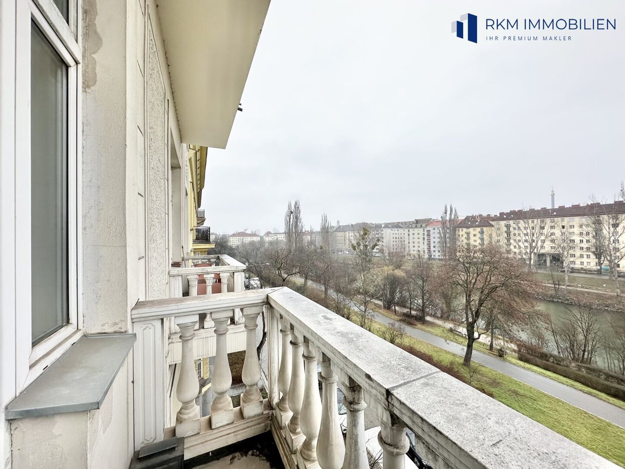 Hochwertige Altbau-Details wie hohe Decken, Flügeltüren, Fischgrätparkett und der Balkon mit eleganter Balustrade verleihen der Wohnung besonderen Charme. Von hier genießen Sie einen wunderschönen Blick auf den Donaukanal.