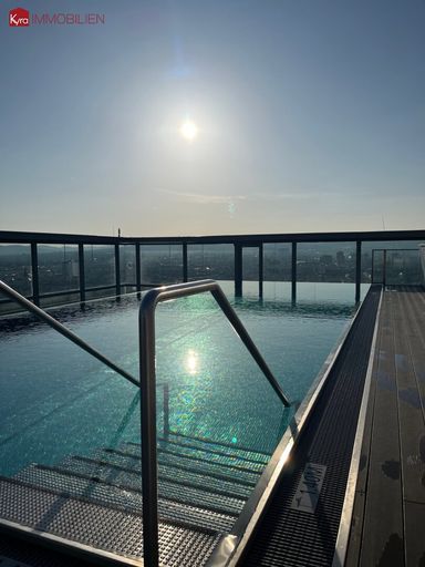 Die moderne Einbauküche (Tischler Küche) ist funktional und stilvoll gestaltet, ideal für Hobbyköche und Genießer. Das Badezimmer ist mit einer eleganten bodengleichen Dusche (Villeroy und Boch Fliesen) und einem modernen Dusch-WC ausgestattet und fügt sich harmonisch in das Gesamtbild der Wohnung ein. Als besonderes Highlight steht Ihnen ein Rooftop-Pool mit Skyline-Feeling zur Verfügung, der Erholung und Freizeitspaß direkt im Haus ermöglicht.