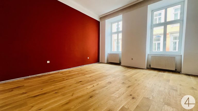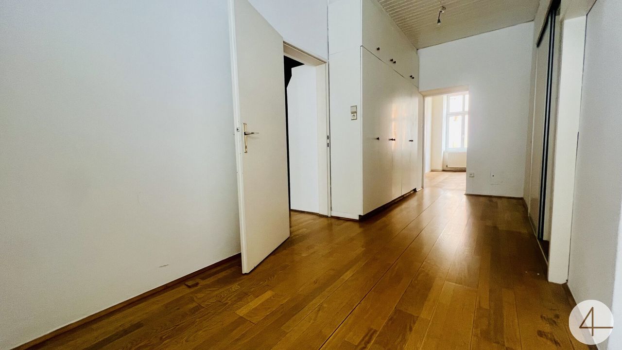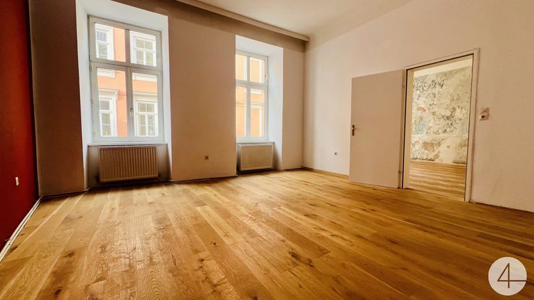 Die Kombination aus Altbauflair und modernem Zustand verleiht der Wohnung eine besonders elegante Atmosphäre. In einem Zimmer wurden alte Wandfresken freigelegt.