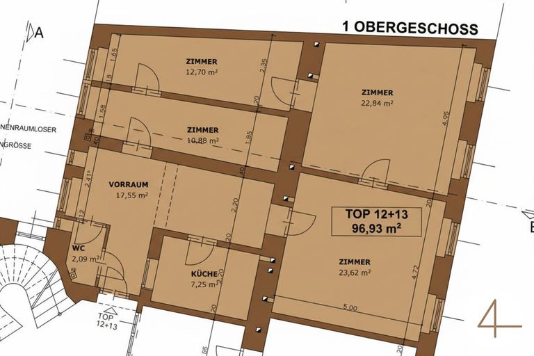 Der Plan weicht von der tatsächlichen Raumaufteilung ab, da das Badezimmer nachträglich in einen Raum integriert wurde.