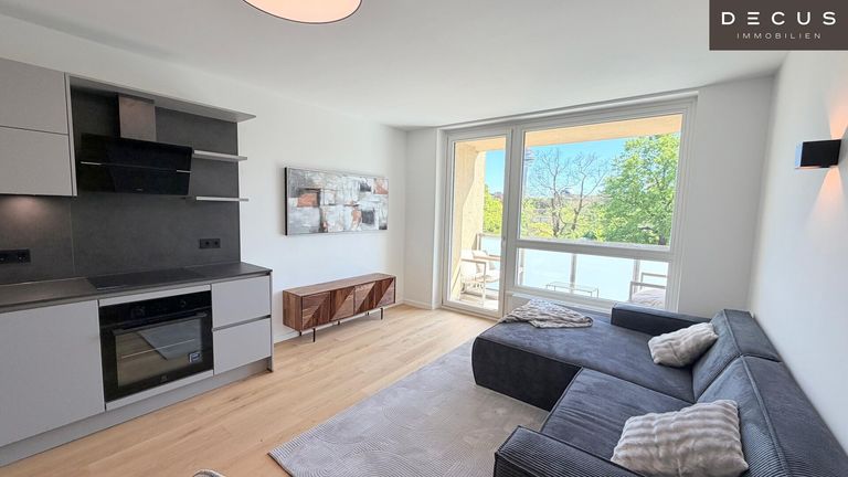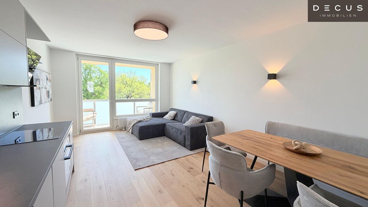 Die Designerküche ist voll ausgestattet – inklusive Induktionsherd und hochwertigen Geräten – und fügt sich harmonisch in den offenen Wohnbereich ein. Wohnzimmer sowie ein Schlafzimmer sind bereits stilvoll möbliert; im Kaufpreis inkludiert sind die Küche und Badmöbel, die übrige Einrichtung ist nicht Bestandteil des Kaufpreises.